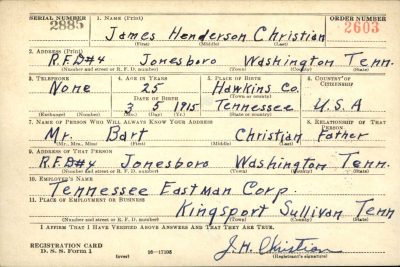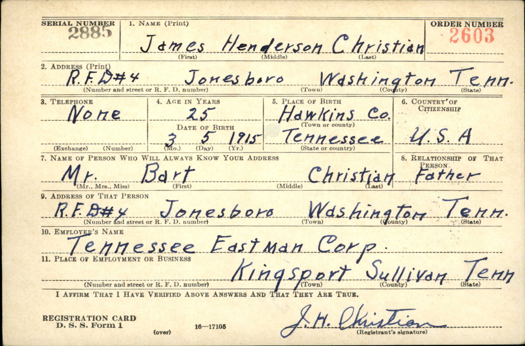 James Henderson Christian was the son of Barton Bart Christian and Maude Matilda Bailey. He was married to Sarah Ann Bailey on 10 October 1941 in Bristol, Washington County, Virginia.