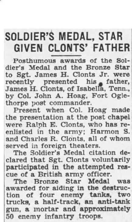 Posthumous awards of the Soldier’s Medal and the Bronze Star to Sgt. James H. Clonts Jr., were recently presented his father, James H. Clonts of Isabella, Tenn., by Col. John A. Hoag, Fort Oglethorpe post commander. Present when Col. Hoag made the presentation at the post chapel were Ralph E. Clonts, who has re-enlisted in the army; Harmon S. and Charles R. Clonts, all of who served attempted rescue of a British army officer. The Bronze Star Medal was awarded for aiding in the destruction of four enemy tanks, two trucks, a half-track, an anti-tank gun, a mortar and approximately 50 enemy infantry troops.in foreign theaters. The Soldier’s Medal citation declared that Sgt. Clonts voluntarily participated in the