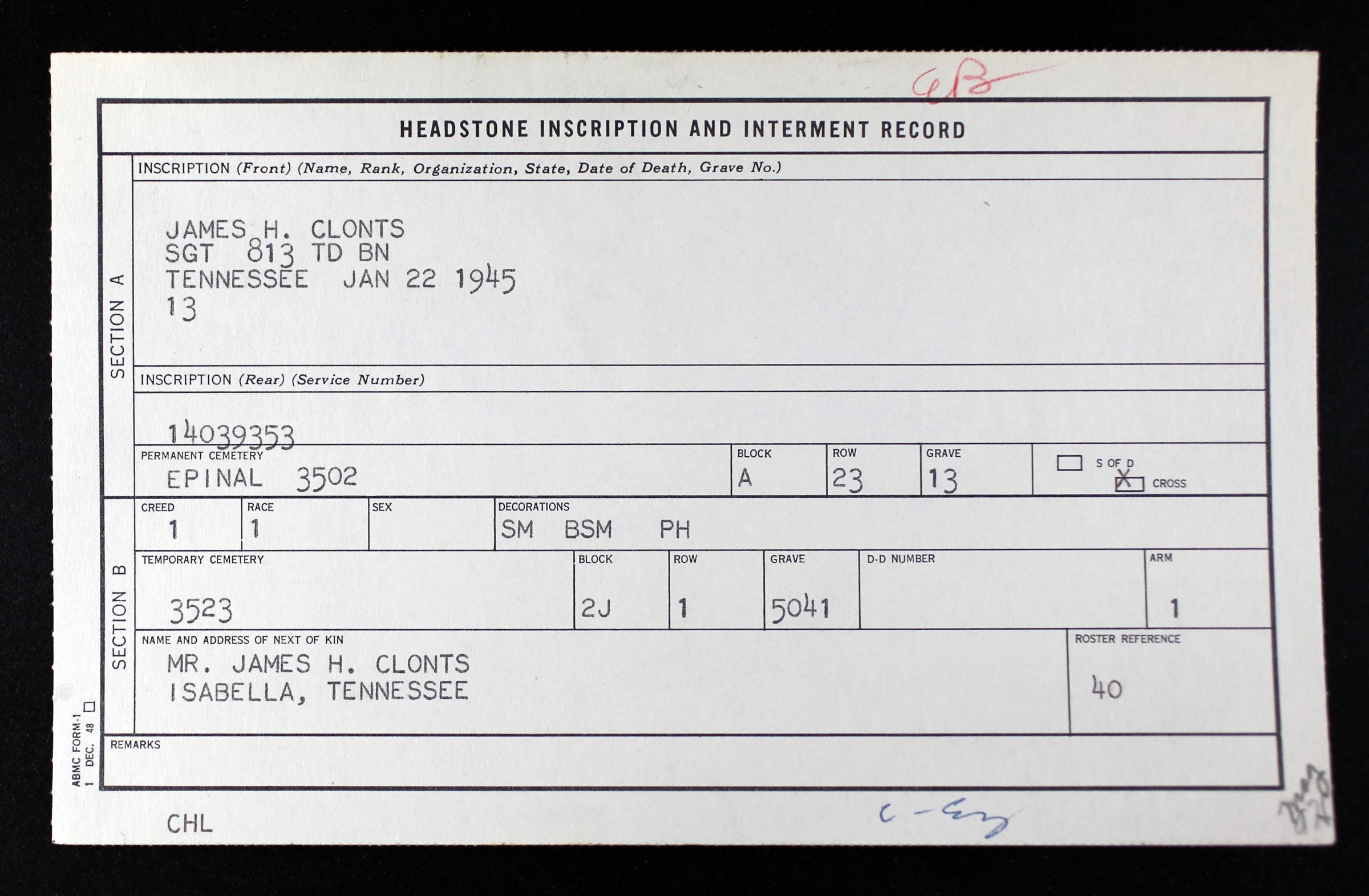 Sergeant Clonts was killed in action on 25 January 1945 and is interred at the Epinal American Cemetery, Epinal, France.