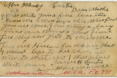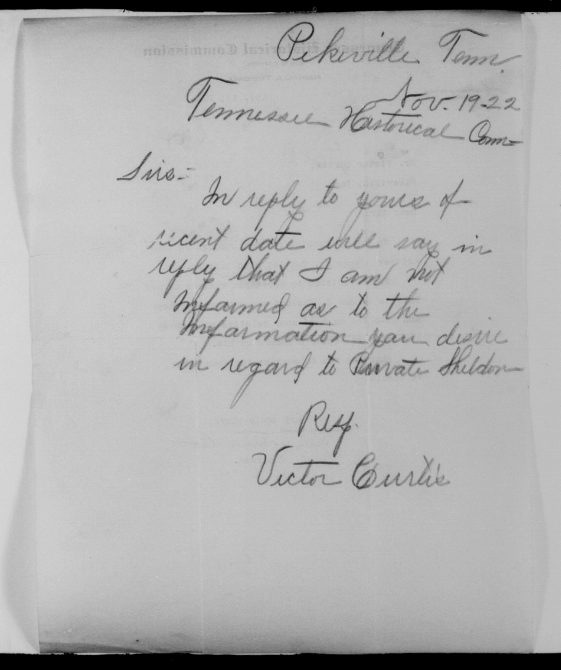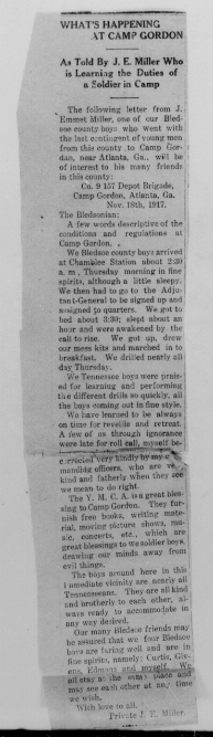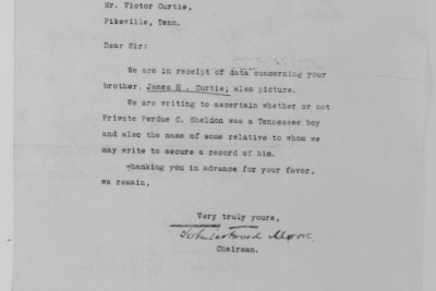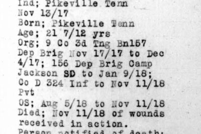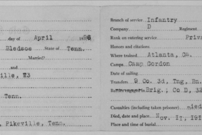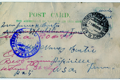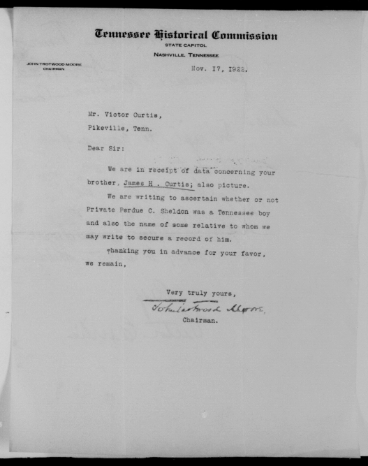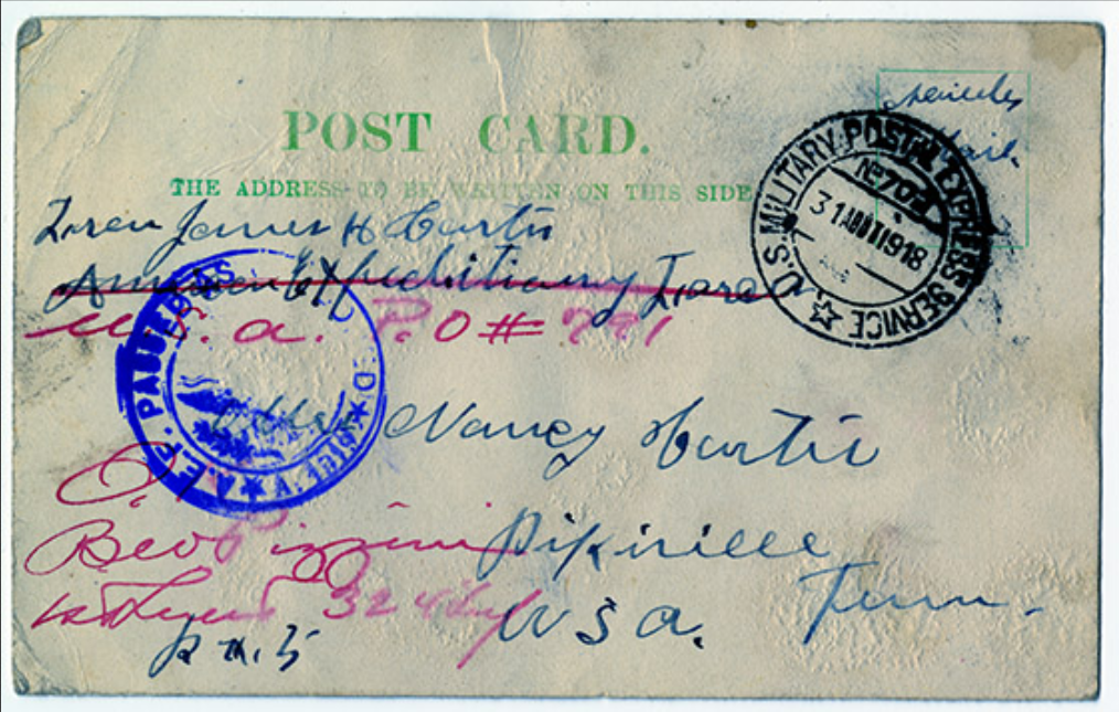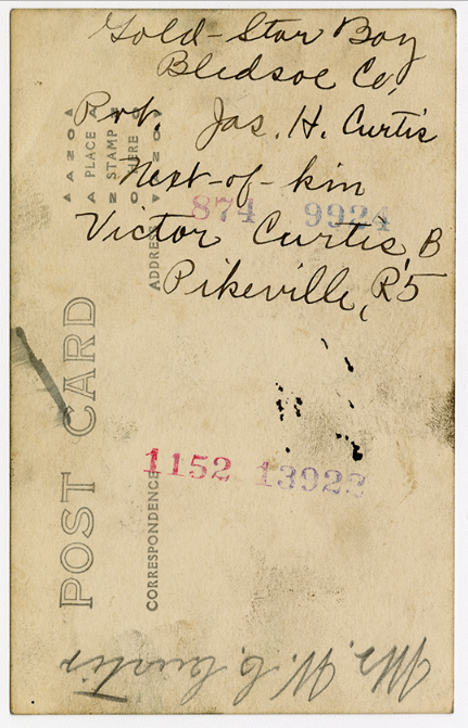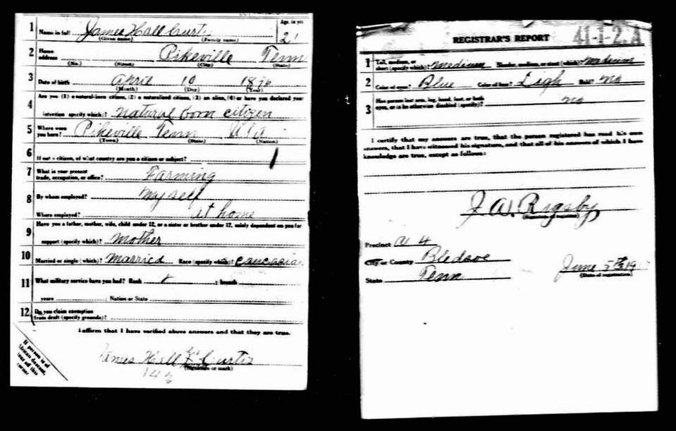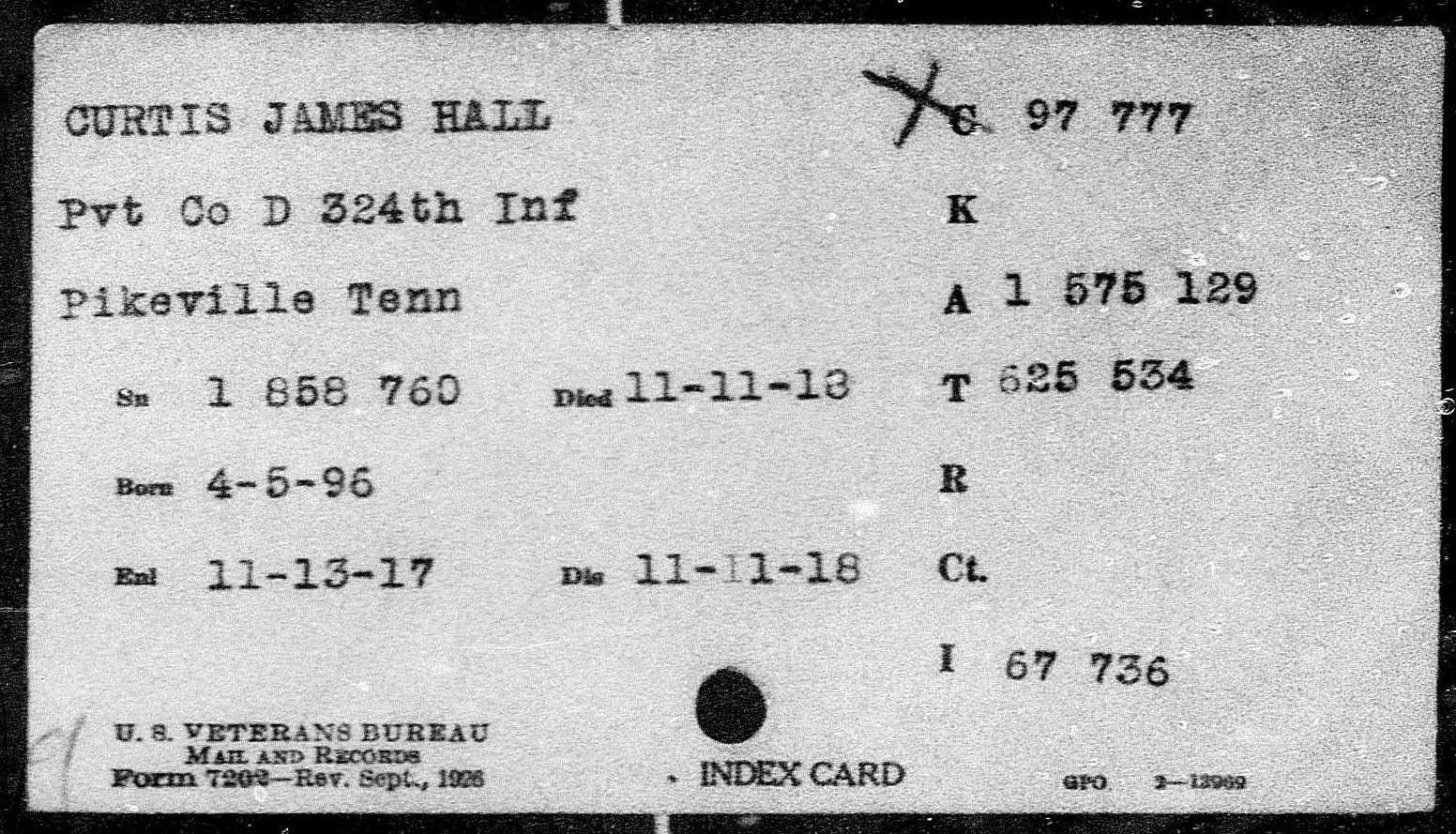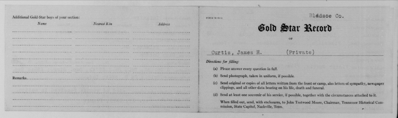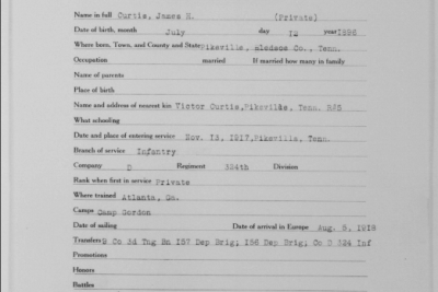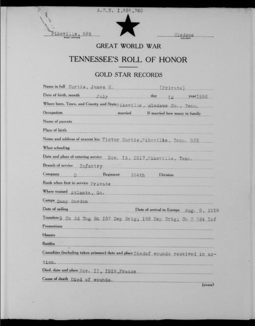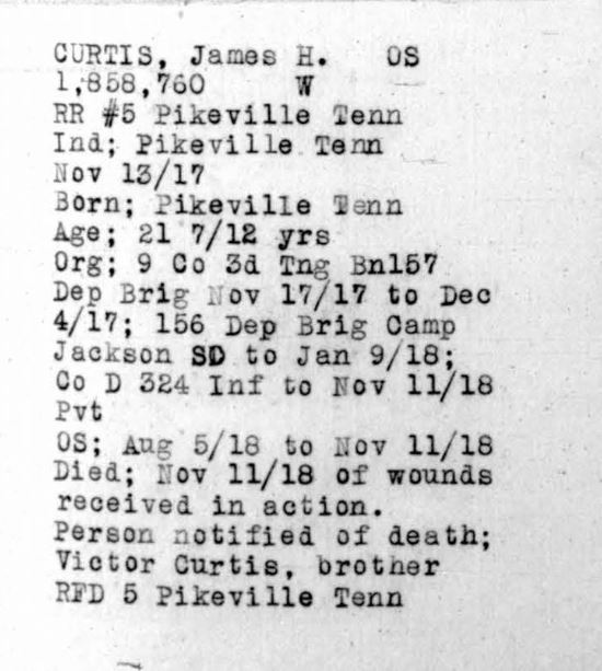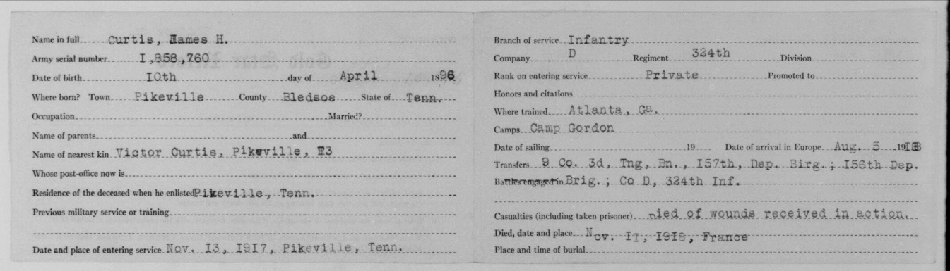 James Hall Curtis was born 10 April 1896, Pikeville, Tennessee. He entered the service November 13, 1917 at Pikeville, Tennessee and received his training at Camp Gordon in Atlanta, Georgia. He arrived in Europe August 5, 1918. Pvt Curtis died of wounds received in action in France.