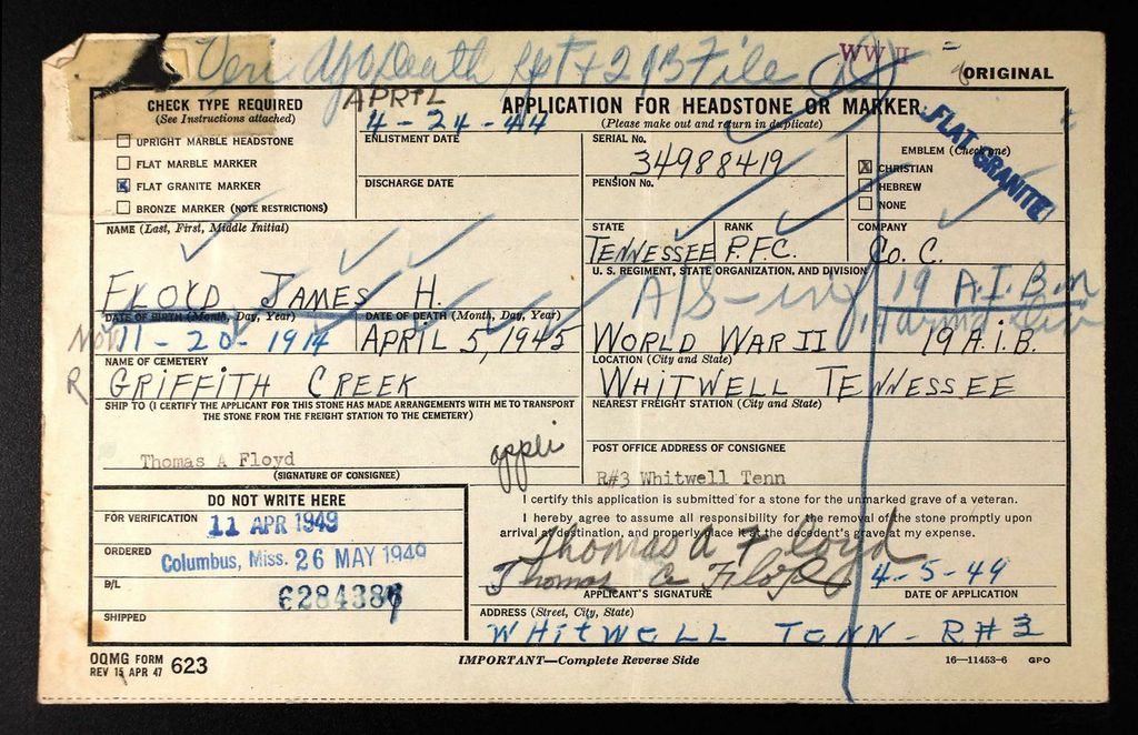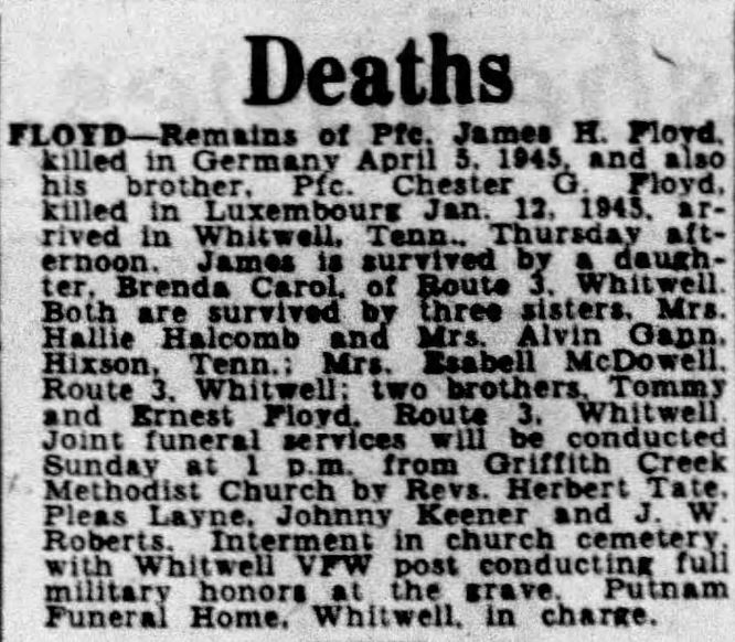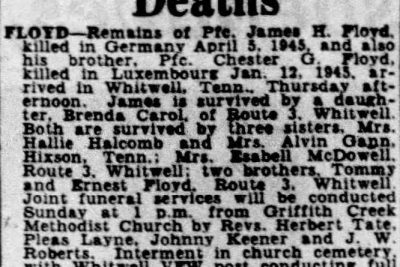 He was killed in action on 5 April 1945 in Germany. His brother, Chester Garfield Floyd was killed in action on 12 January 1945. The remains of both brothers were returned to the US and buried at the Griffith Creek Cemetery in December 1948.