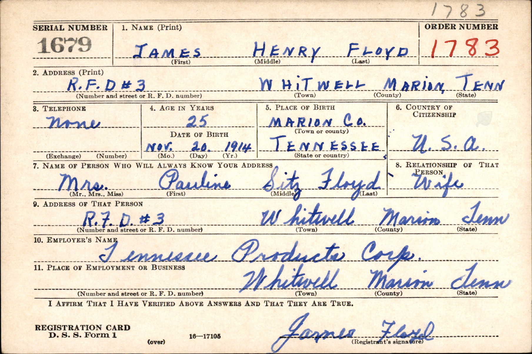 James Henry Floyd was born on 20 November 1914 in Marion County, Tennessee. He was the son of John Thomas Floyd and Rachel Ellen Harrison. He was married to Mattie Pauline Sitz and father of Brenda Carol Floyd.