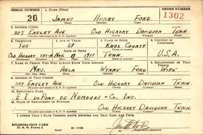 James Henry Ford was the son of Walter Ford and Lula Cordelia Huffaker. He married Arla Wynne Gibbs on 11 January 1938 in Guilford, North Carolina.