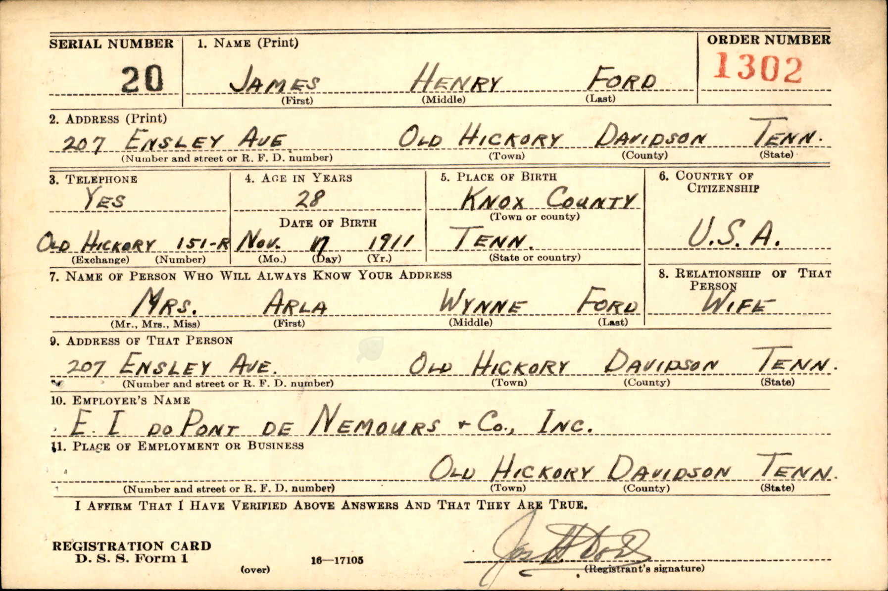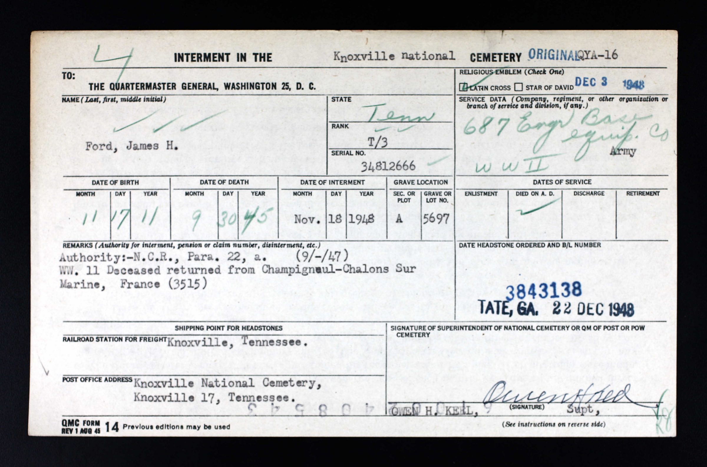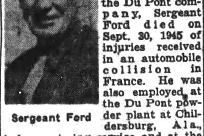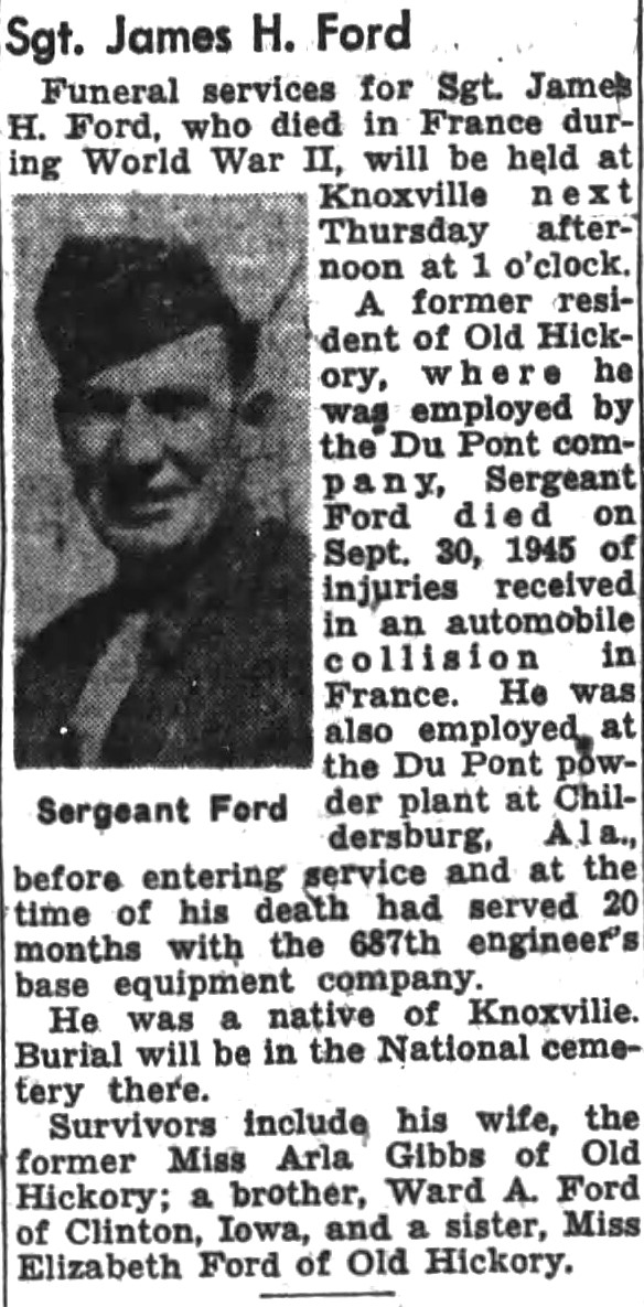 Funeral services for Sgt. James H. Ford, who died in France during World War II, will be held at Knoxville next Thursday afternoon. A former resident of Old Hickory, where he was employed by the Du Pont company, Sergeant Ford died on Sept. 30, 1945 of injuries received in an automobile collision in France. He was employed at the Du Pont power plant at Childersburg, Ala., before entering service and at the time of his death has served 20 months with the 687th engineer’s base equipment company. He was a native of Knoxville. Burial will be in the National cemetery here. Survivors include his wife, the former Miss Arla Gibbs of Old Hickory; a brother, Ward A Ford of Clinton, Iowa and a sister, Miss Elizabeth Ford of Old Hickory.