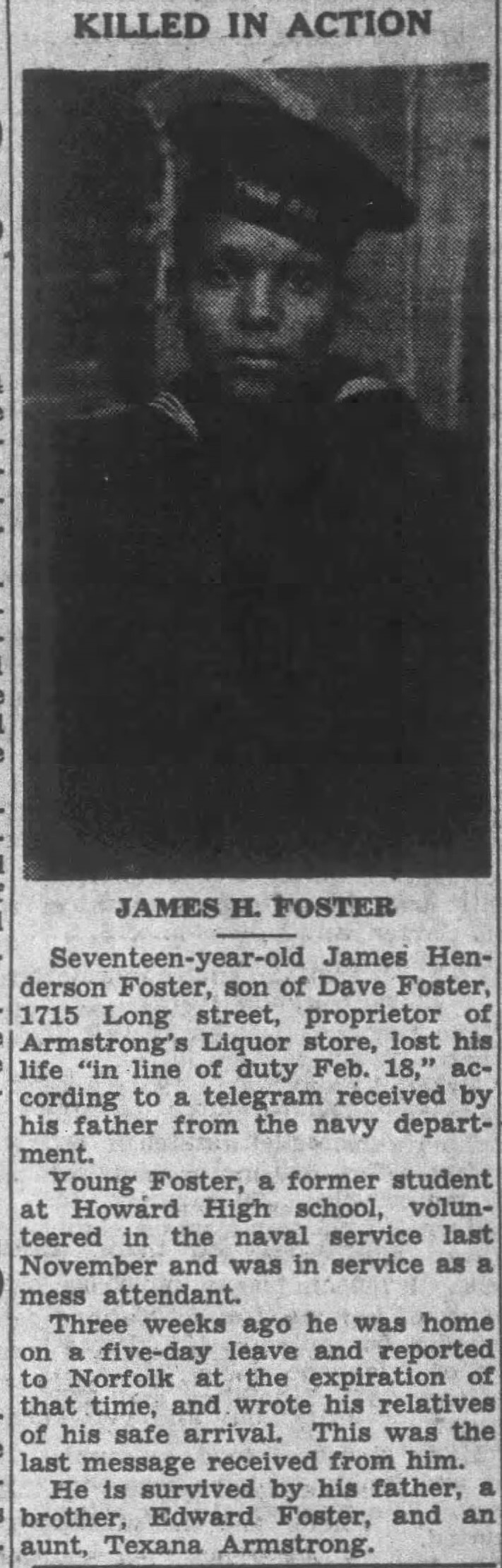 Seventeen-year-old James Henderson Foster, son of Dave Foster, 1715 Long street, proprietor of Armstrong’s Liquor store, lost his life “in the lie of duty Feb. 18” according to a telegram received by his father from the navy department. Young Foster, a former student at Howard High School, volunteered in the naval service last November and was in service as a mess attendant. Three weeks ago he was home on a five-day leave and reported to Norfolk at the expiration of that time, and wrote his relatives of his safe arrival. This was the last message received from him. He is survived by his father, a brother, Edward Foster, and an aunt, Texana Armstrong.