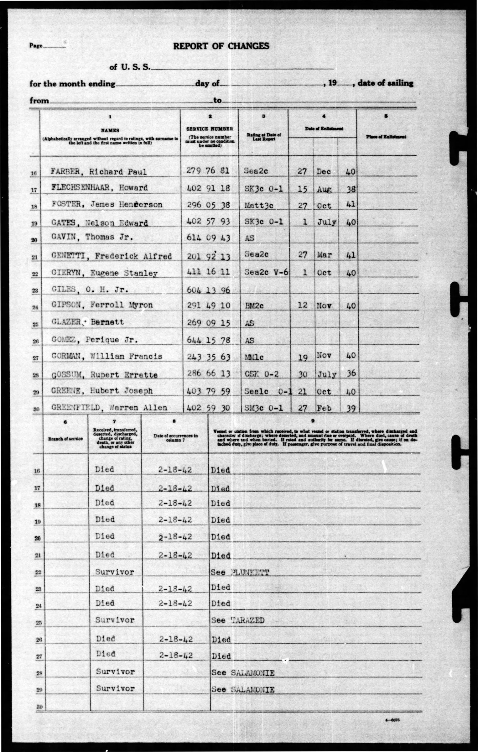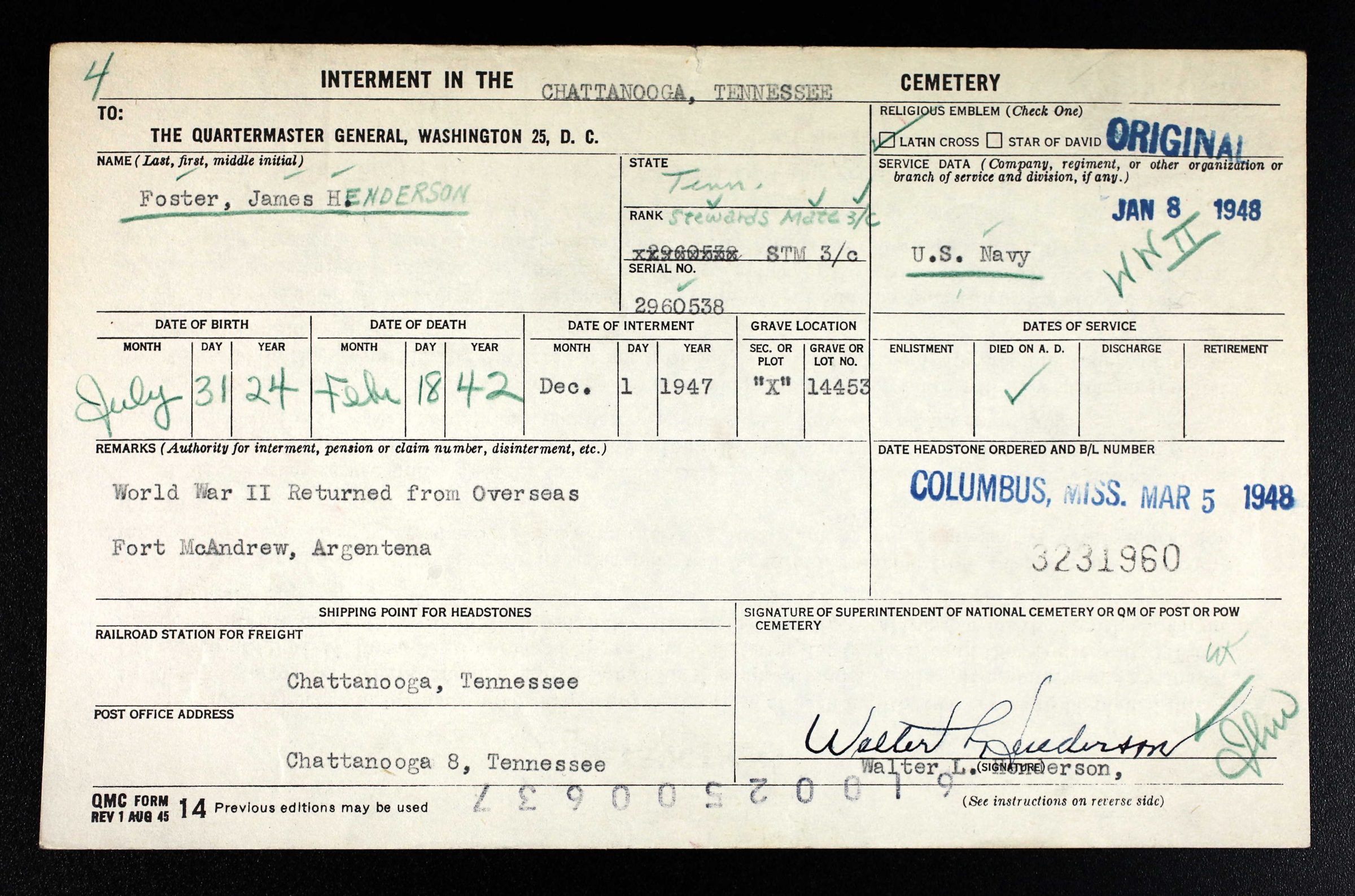 James Henderson Foster (USN-2960538) was born July 31, 1924 and died February 18, 1942 aboard the USS Pollux. He was mustered in the Navy on October 27, 1941 in Nashville, Tennessee and was assigned to the USS Pollux on December 10, 1941 as a Mess Attendant Third Class. The USS Truxton and USS Pollux ran aground near Newfoundland, broke up, and sank killing several aboard each ship.