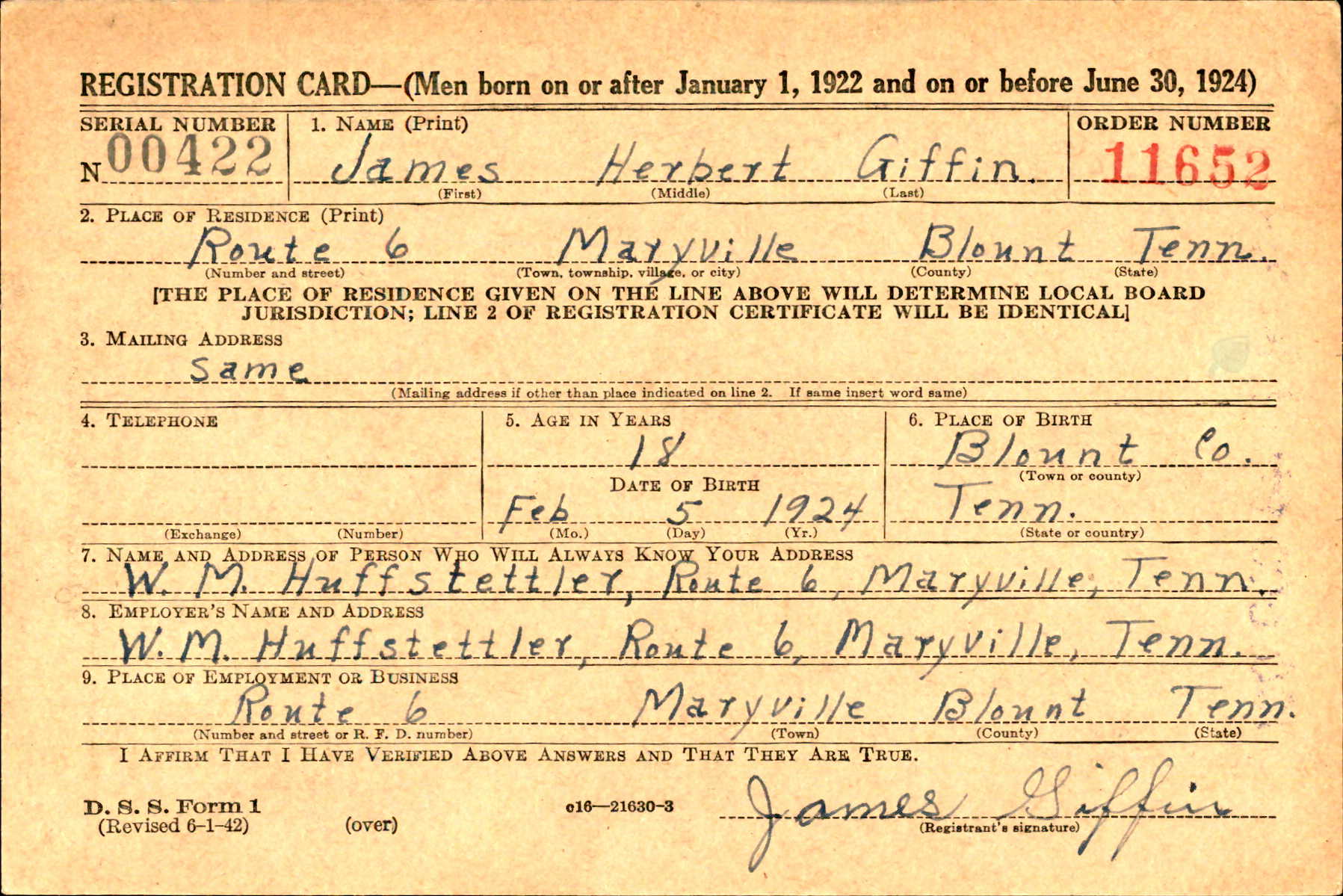 James Herbert Giffin was born at Maryville, Tennessee, the son of Frank Robert Giffin and Jessie Mae Phelps.