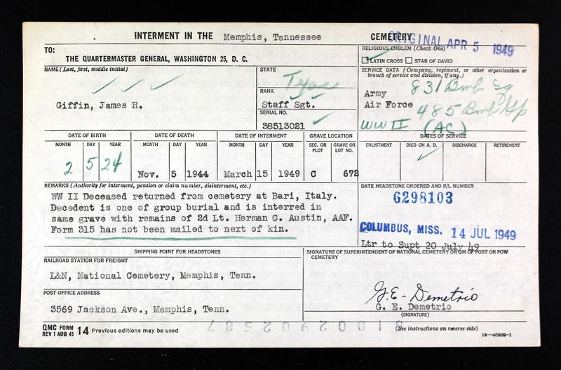 S/Sgt Giffin was returned from Bari, Italy. He was killed aboard B-24J Liberator with serialnumber 42-51299.