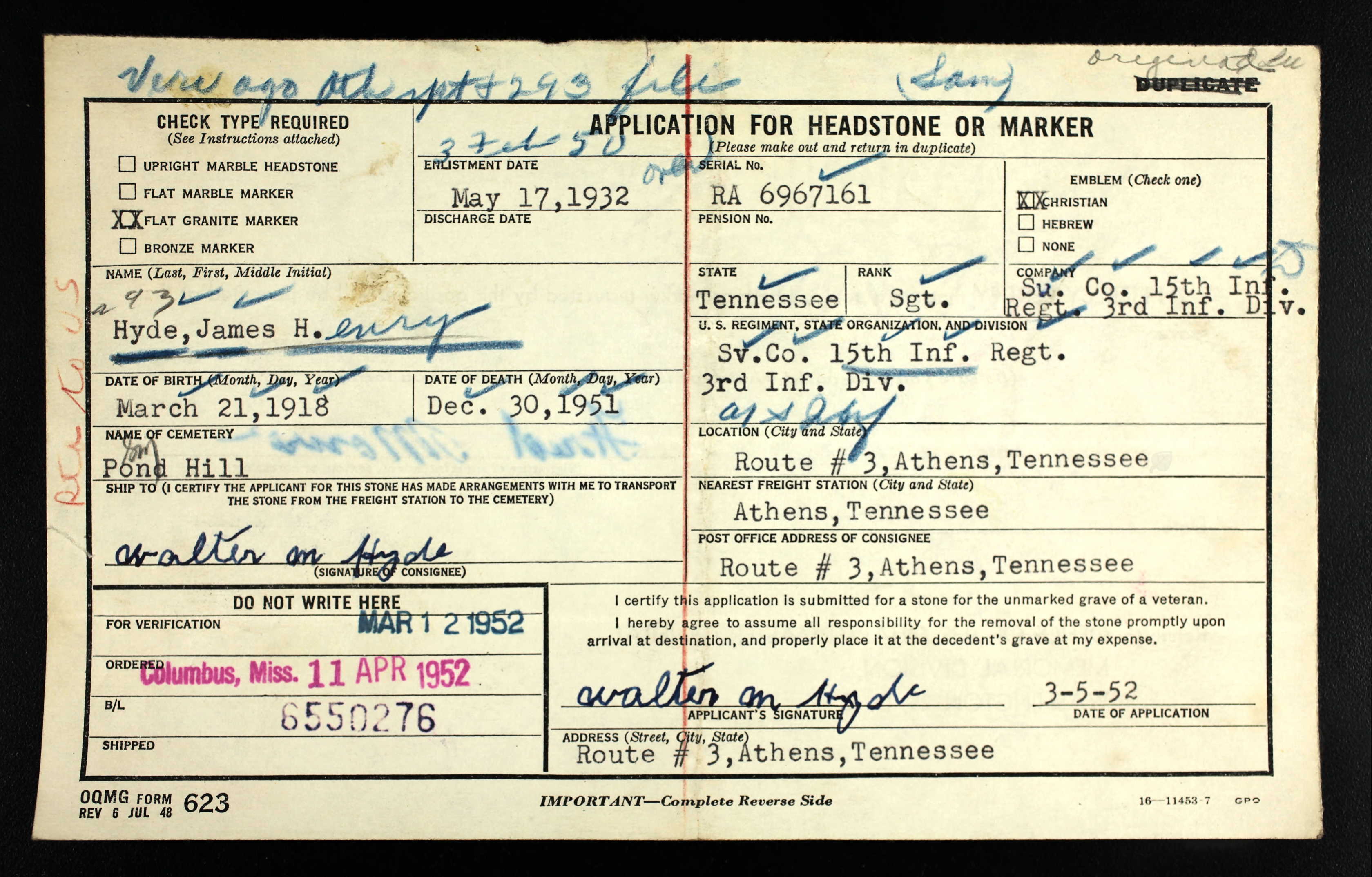 Sergeant Hyde was repatriated to his hometown of McMinn county and was laid to rest in Pond Hill Cemetery, Niota, Tennessee.