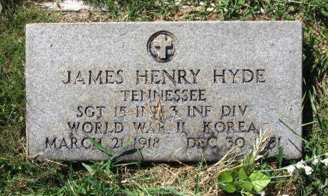 James Hyde was also a veteran of World War II having enlisted in 1939. He served with Service Company, 15th Infantry Regiment , 7th Infantry Division. On December 30, 1951, while serving in Korea, he died of burns received when his tent caught fire as he slept near Yonchen, North Korea.