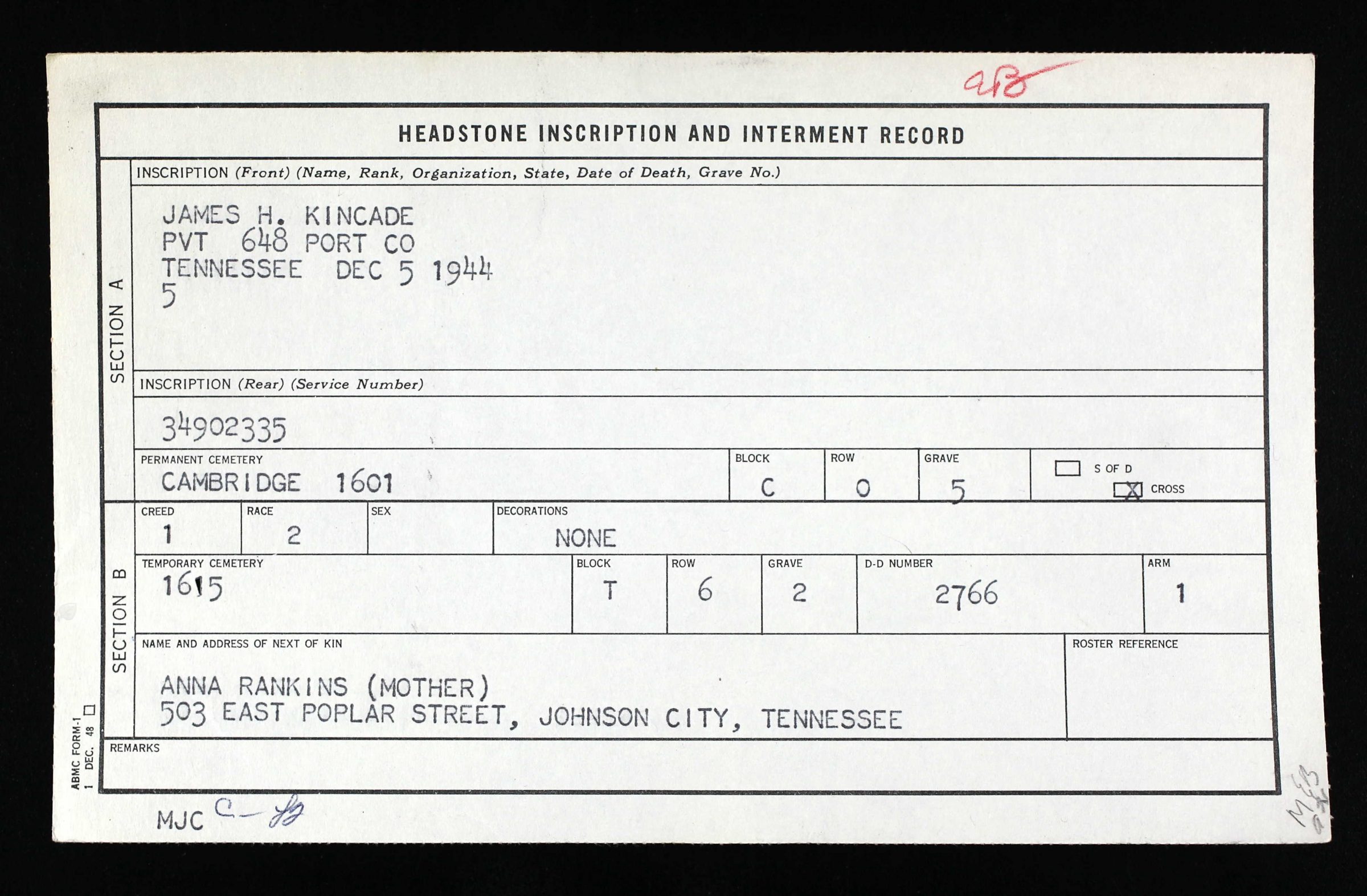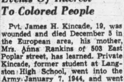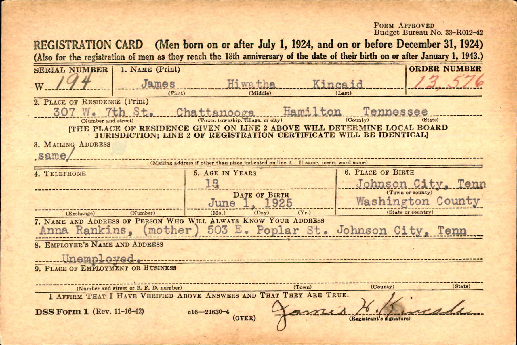 James Hiwatha Kinkade (also spelled as Kincaid) was born in Johnson City, Tennessee, the son of Anna Rankins. He received training at Camp Sutton in North Carolina