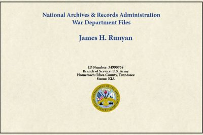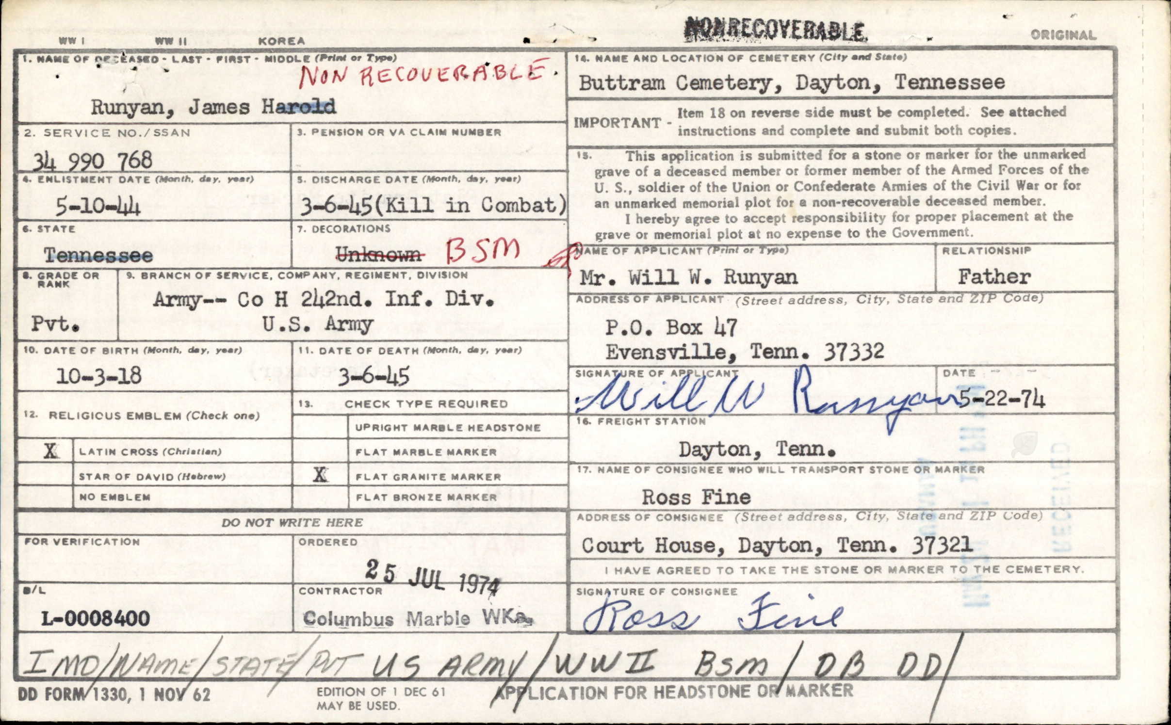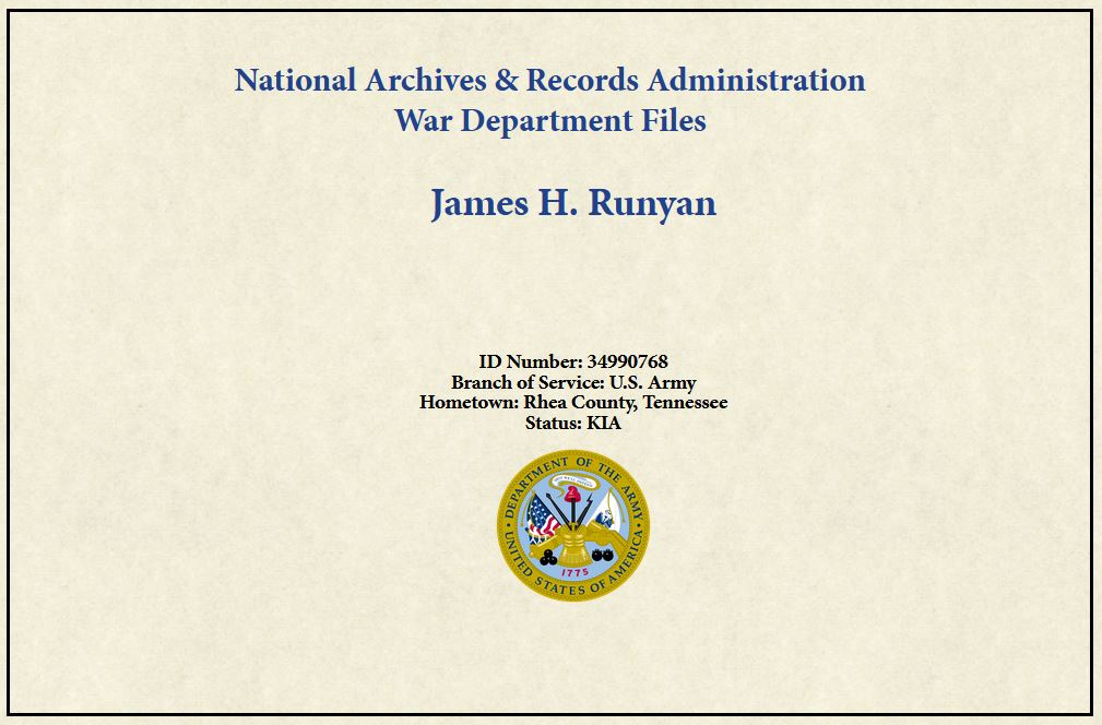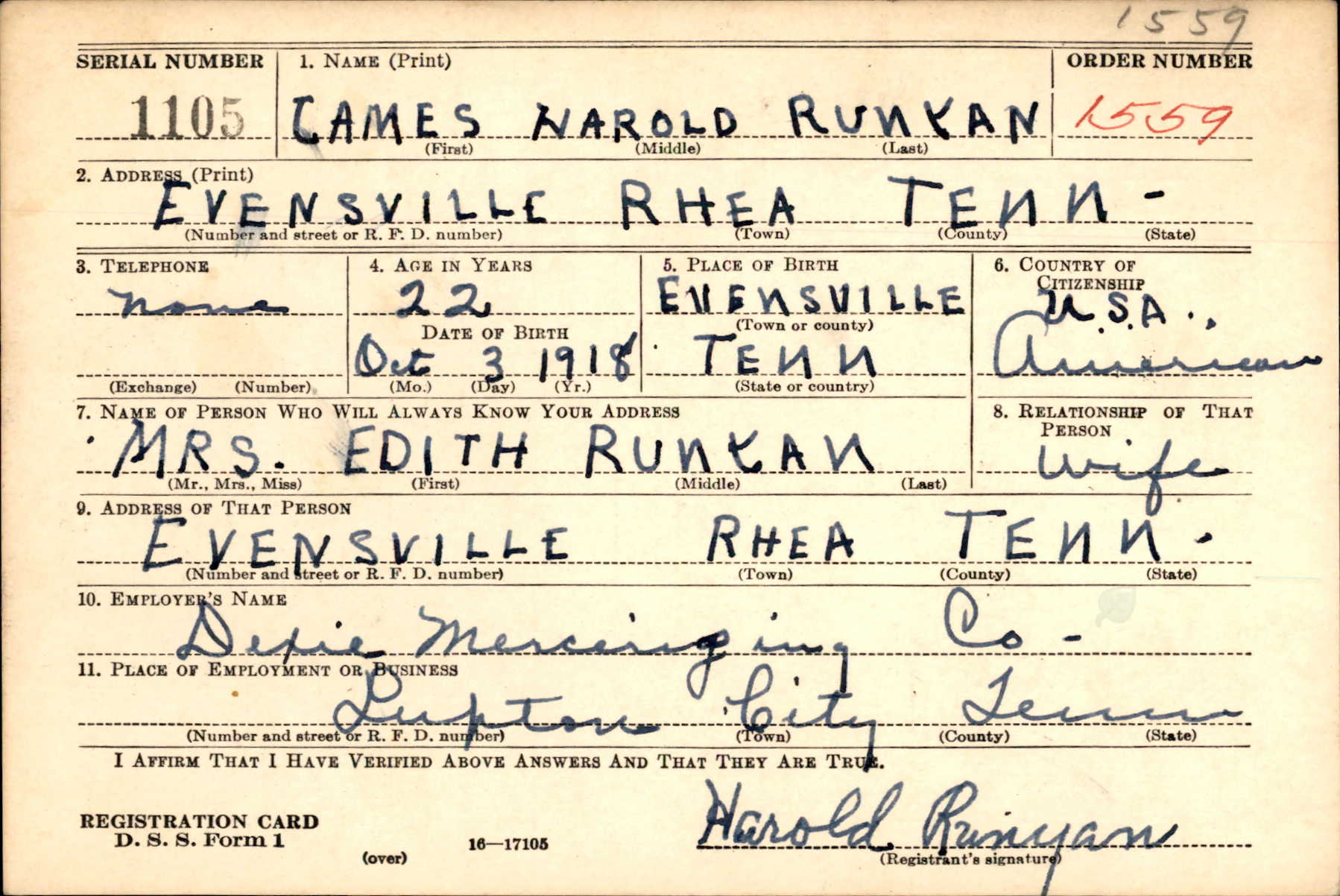 James Harold Runyan was born in Evensville, Tennessee. He was the son of William White Runyan and Myrtle Maude McDowell. Husband of Edith Rebecca Looney and father of Bill Garland Runyan.