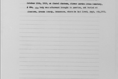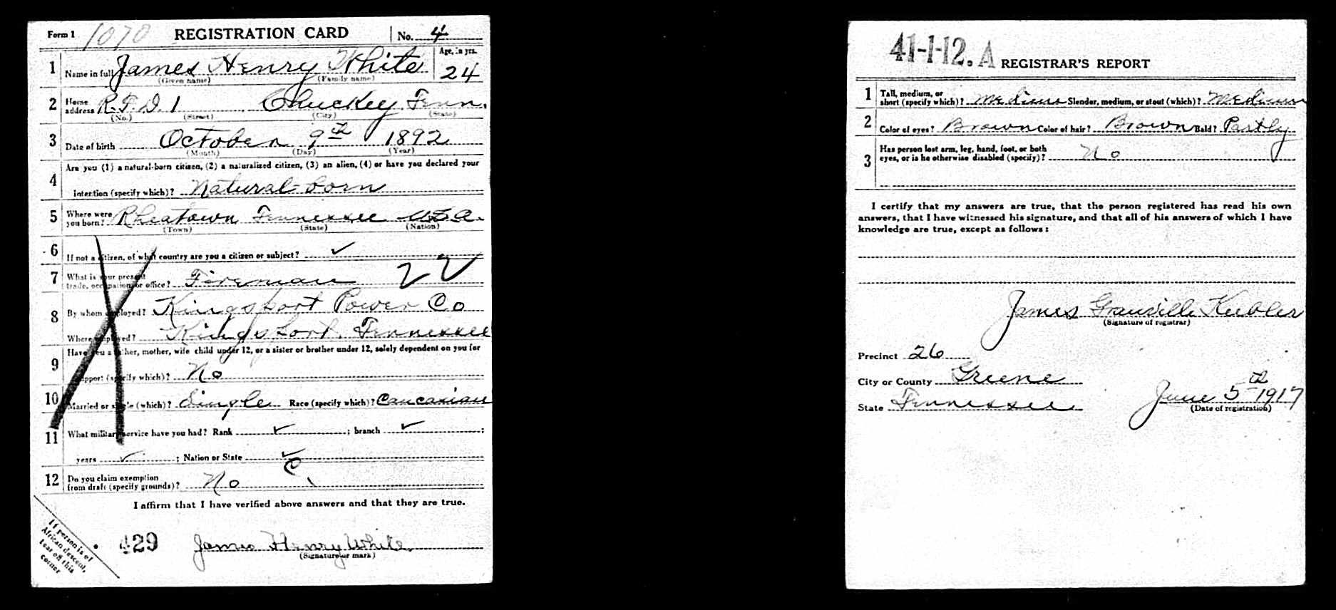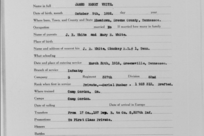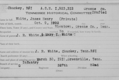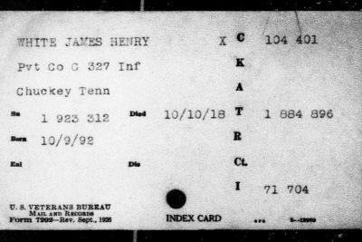 James Henry White was born in Rheatown, Tennessee. He died at the age of 25. Under Special Order #64 of 1 September 1921, his remains were escorted from New York to Washington D.C., and then to Chuckey, Tennessee.