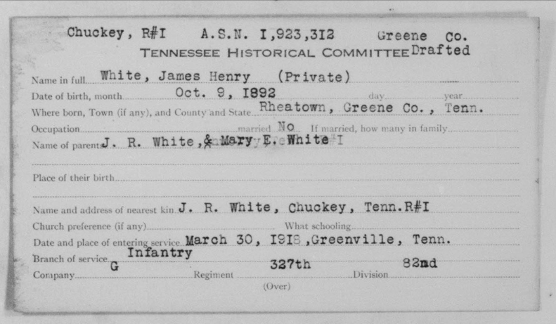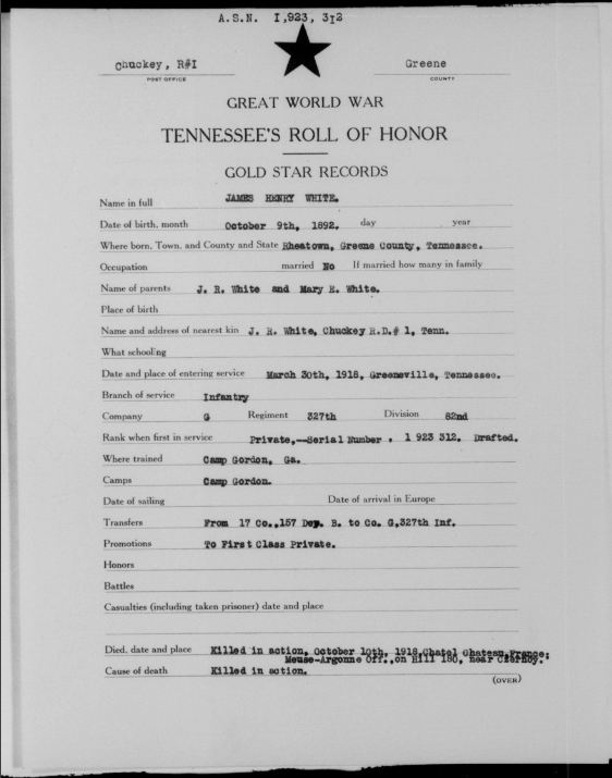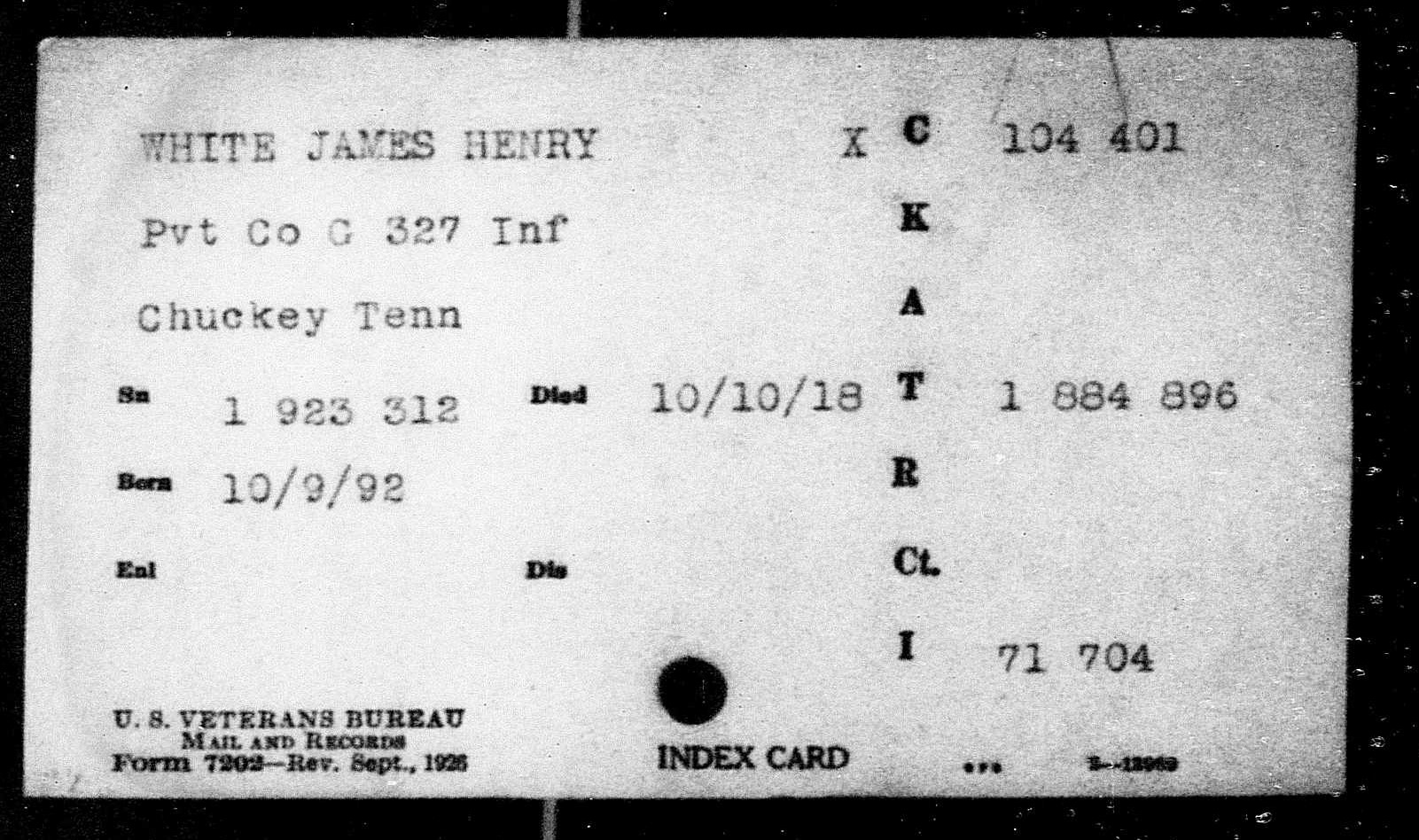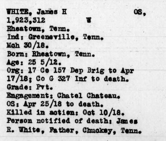James Henry White was born in Rheatown, Tennessee. He died at the age of 25. Under Special Order #64 of 1 September 1921, his remains were escorted from New York to Washington D.C., and then to Chuckey, Tennessee.