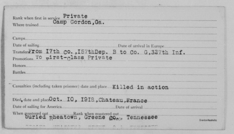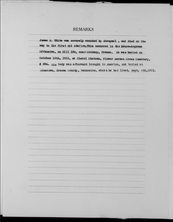James H. White was severely injured by shrapnel and died on the way to the first aid station. This occurred in the Meuse-Argonne Offensive on Hill 180 near Cernoy, France. He was buried on October 12, 1918, at Chatel Chateau Flower Garden Cross Cemetery.