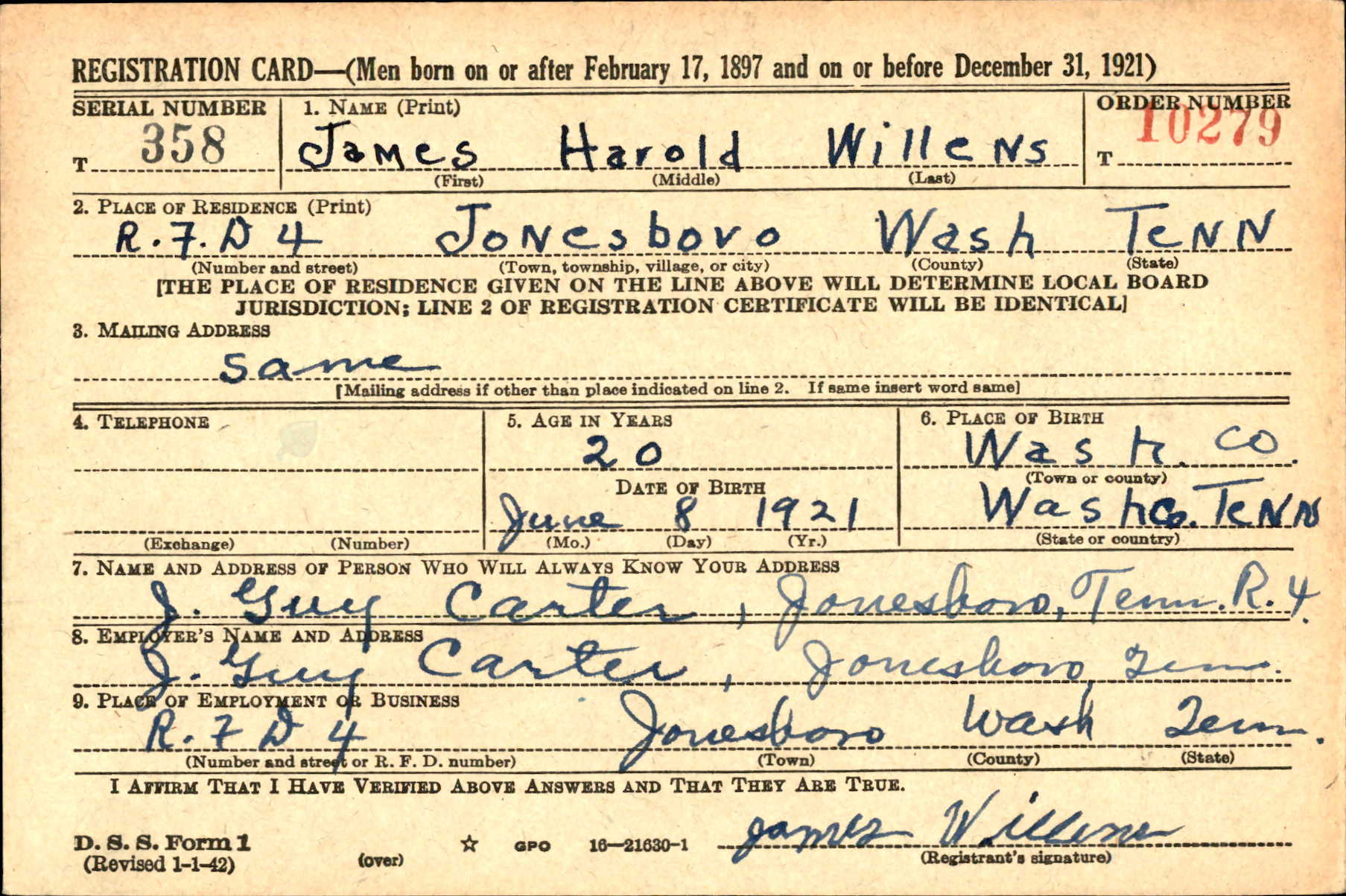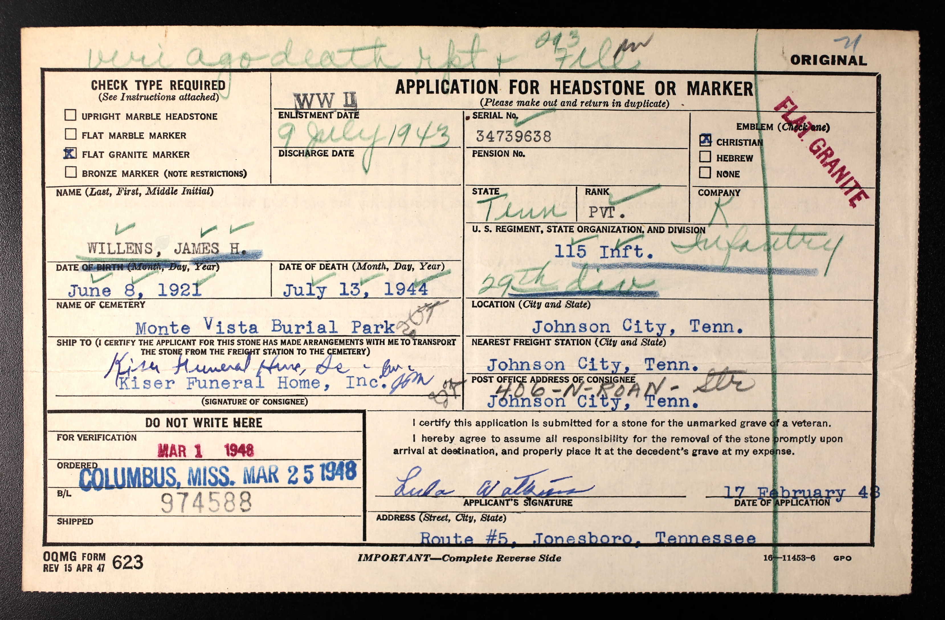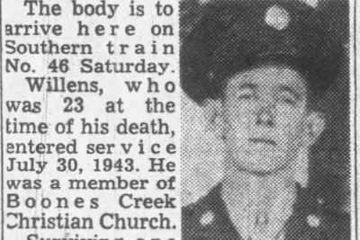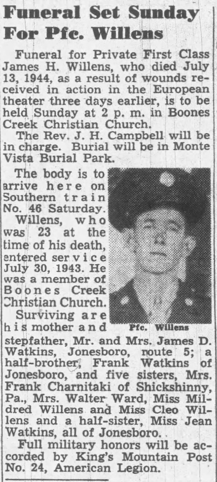 Funeral for Private First Class James H. Willens, who died July 13, 1944 as a result of wounds received in the European theater three days earlier, is to be held in Boones Creek Christian Church. Burial will be in Monte Vista Burial Park. The body is to arrive here on Southern train No. 46 Saturday. Willens, who was 23 at the time of his death, entered the service July 30, 1943. He was a member of Boones Creek Christian Church. Surviving are his mother and stepfather,, Mr. and Mrs. James D. Watkins, Jonesboro, route 5; a half-brother, Frank Watkins of Jonesboro and five sisters, Mrs. Frank Charnitaki of Shickshinny, Pa., Mrs. Walter Ward, Miss Mildred Willens and Miss Cleo Willens and a half-sister, Miss Jean Watkins, all of Jonesboro.