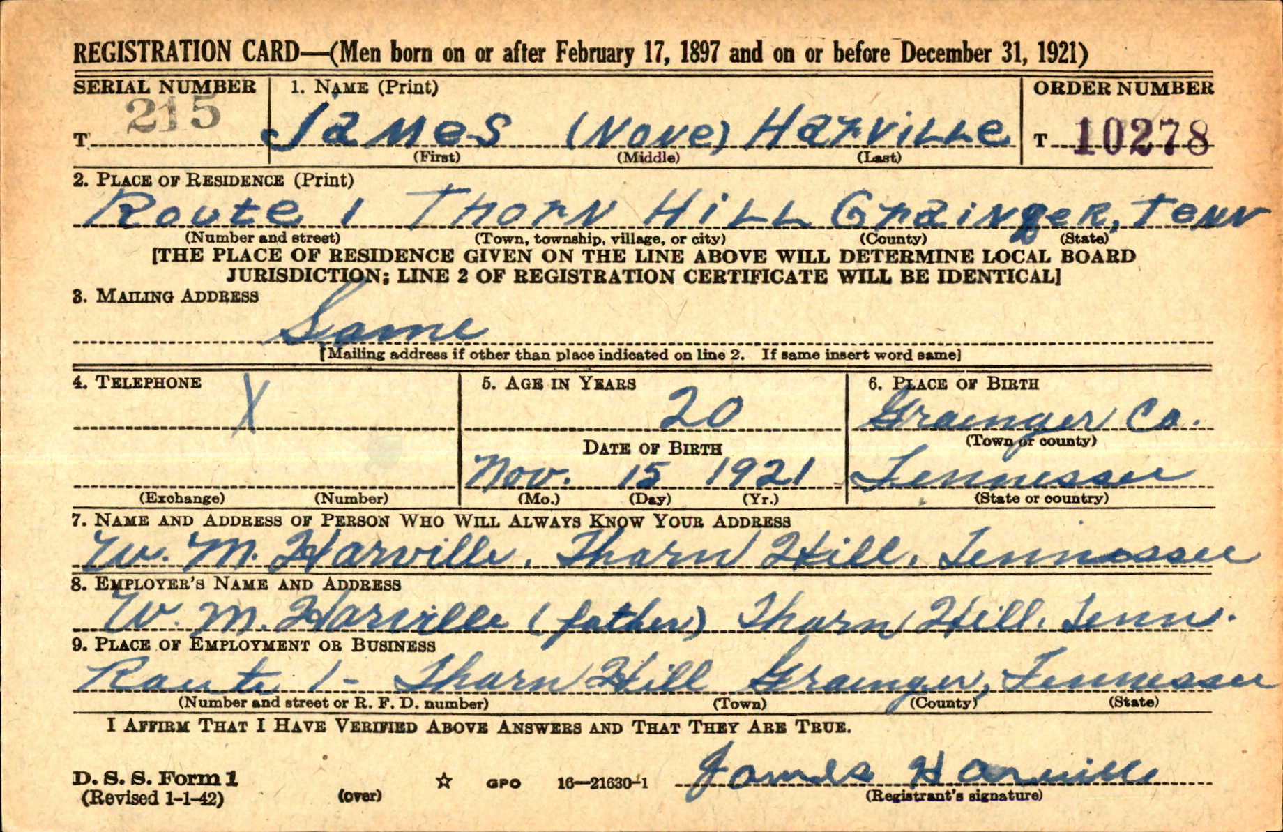 James Harville was born on 15 November 1921, the son of William “Bill” McKinley Harville and Vena Annie Singleton.