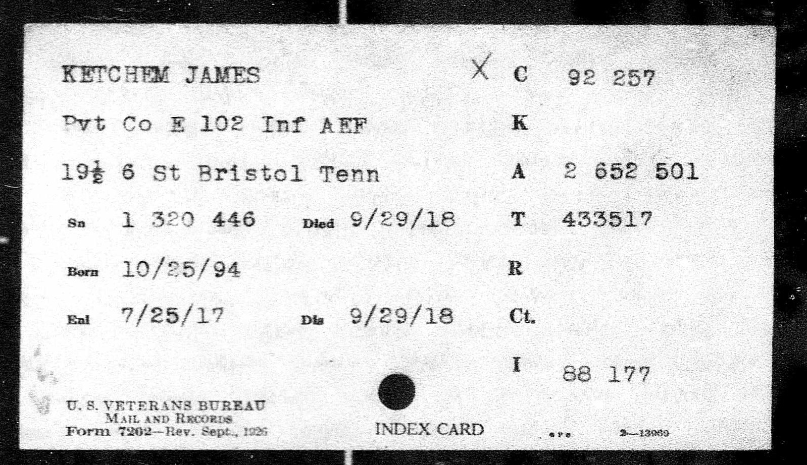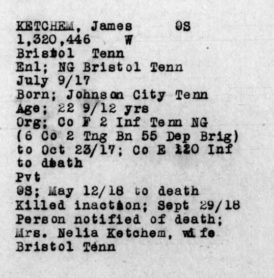 James Alvin Ketchem was born on 25 October 1894, Johnson City, Tennessee. He was the son of Andrew Ketchem and Annie Denny. Husband of Ila Margaret Perry.