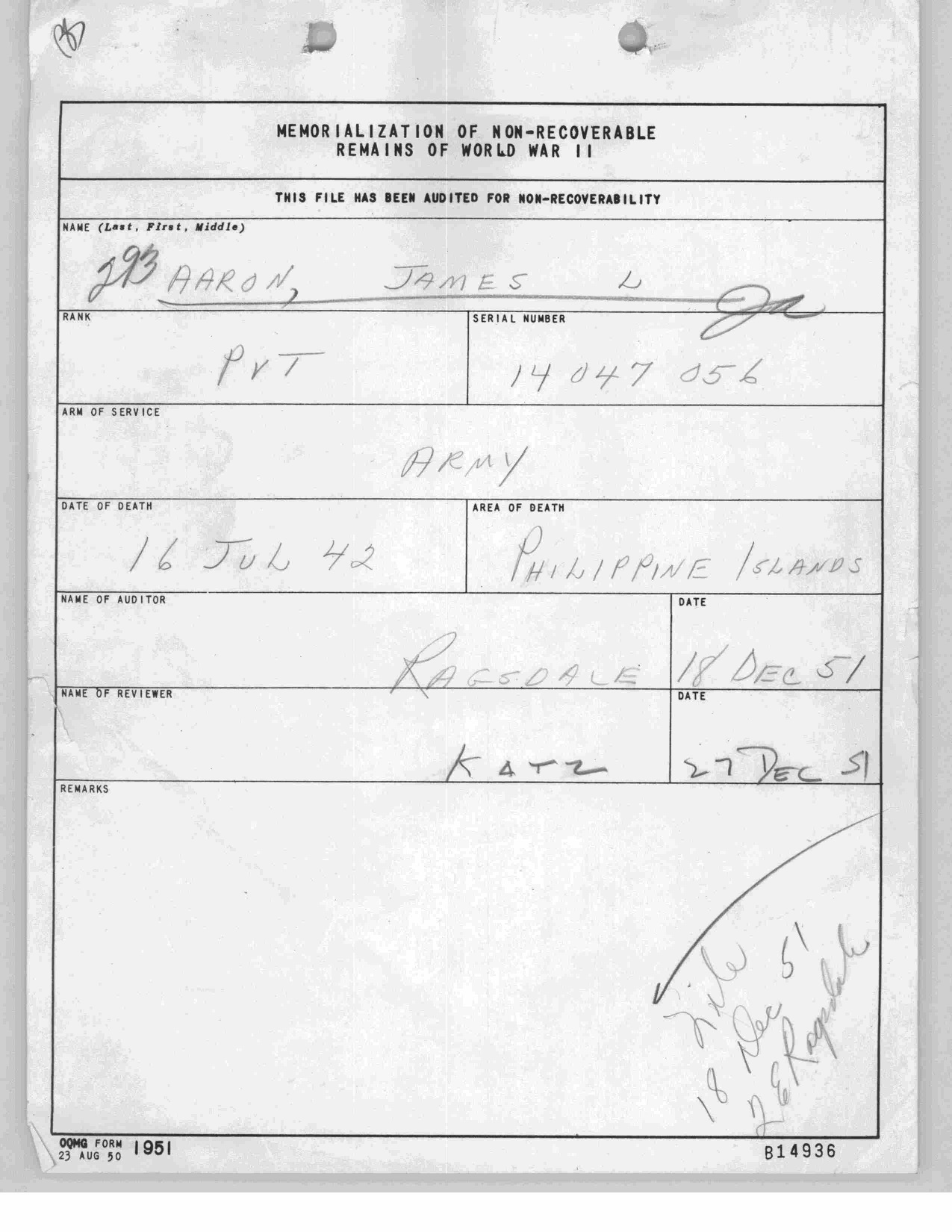 Private James L. Aaron served in the 31st Infantry Regiment in the Philippines following the bombing of Manila and invasion by the Empire of Japan. The unit fought until it surrendered on 9 April 1942. He died of cerebral malaria while interned at the Cabanatuan POW camp, Nueva, Ecija,Luzon, Philippines.