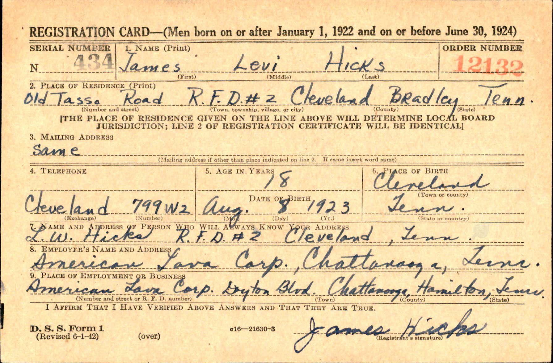 James Levi Hicks was born August 8, 1923, in Cleveland, Tennessee, and enlisted at Fort Oglethorpe, Georgia on February 18, 1943. He was the son of Levi Wilson Hicks and Cleo Effie Randolph Hicks and had one year of college at the time of his enlistment.