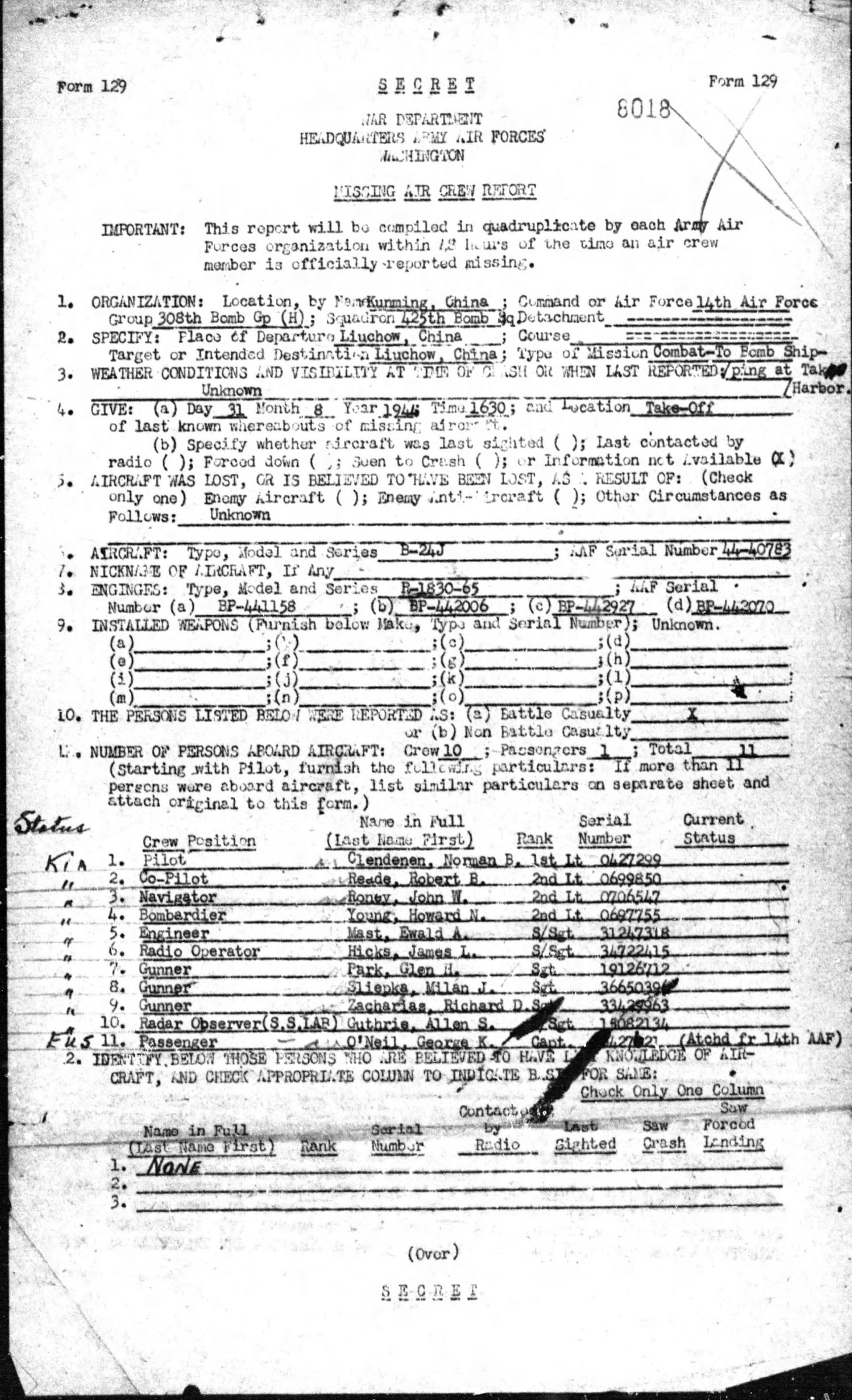 Sergeant Hicks was a radioman aboard a B-24J-180 CO Liberator 44-40783 assigned to the 14th Air Force, 308th Bombardment Group, 425th Bombardment Squadron.
