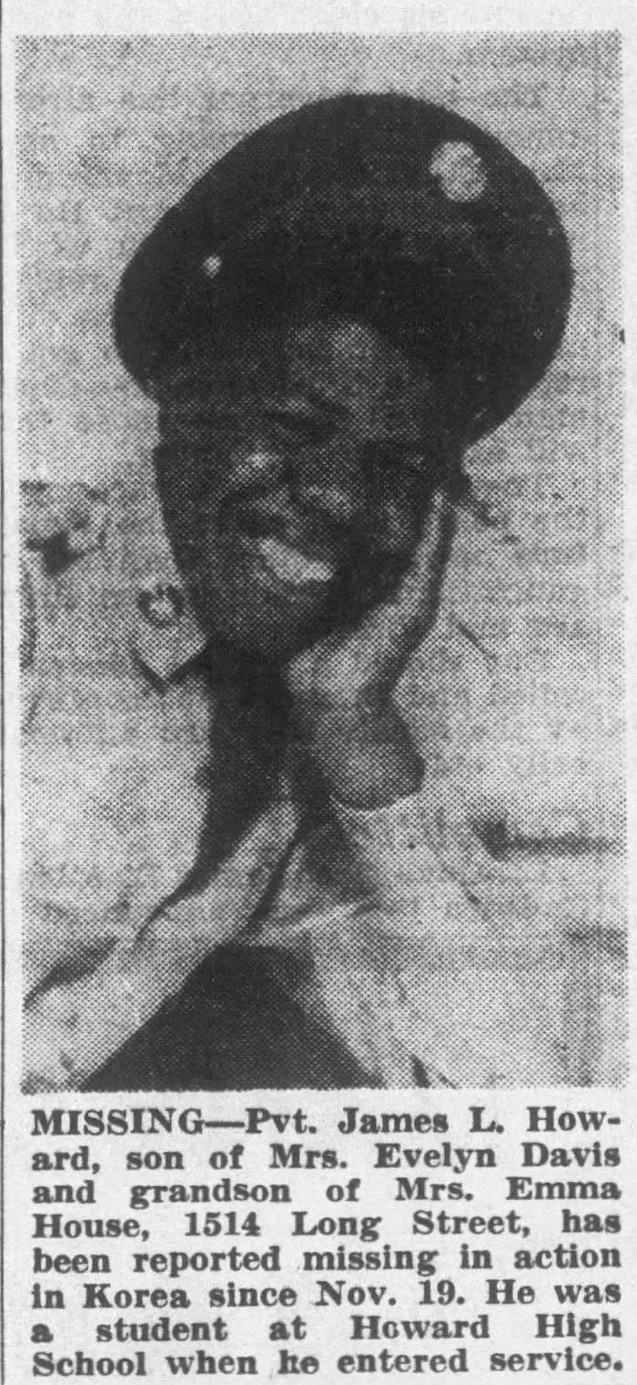 Pvt. James L. Howard, son of Mrs. Evelyn Davis and grandson of Mrs. Emma House, 1514 Long Street, has been reported missing in action in Korea since Nov. 19. He was a student at Howard High School when he entered service.