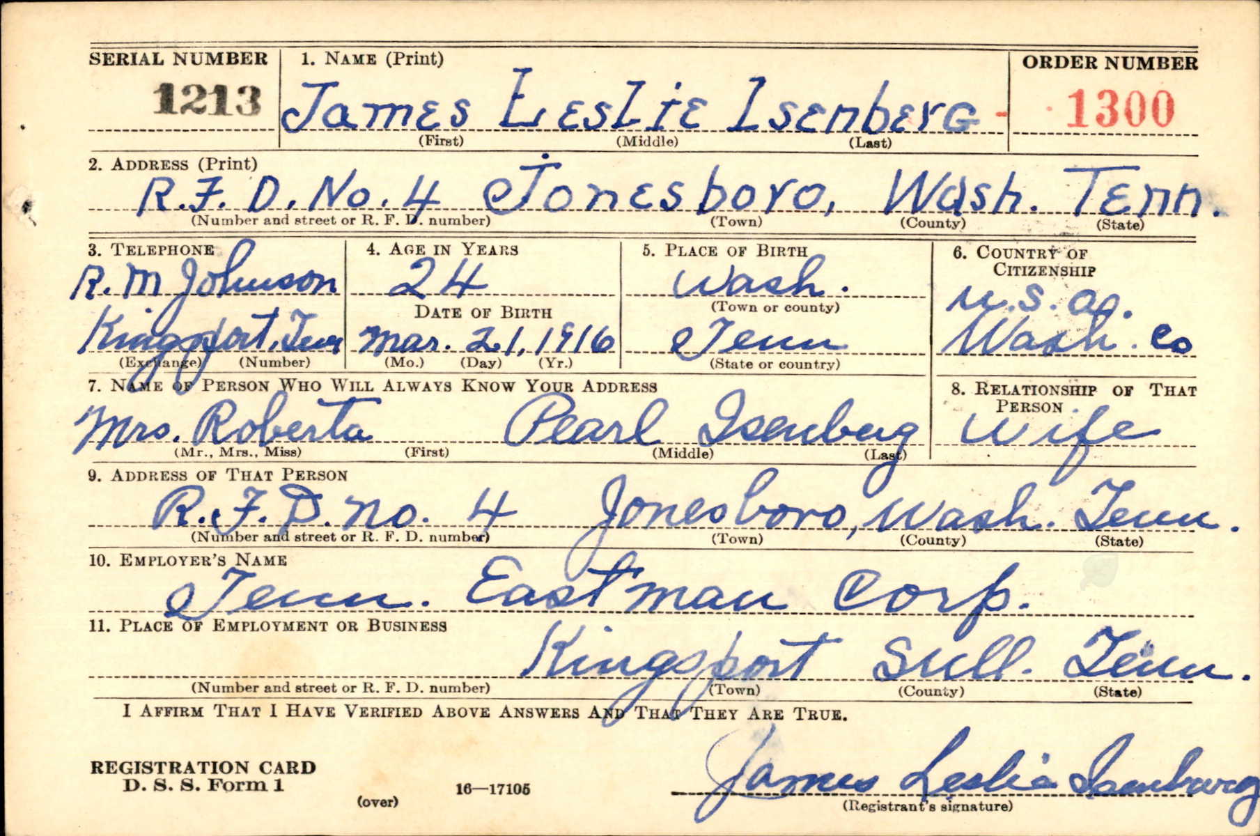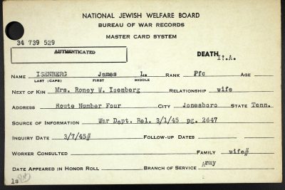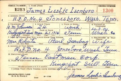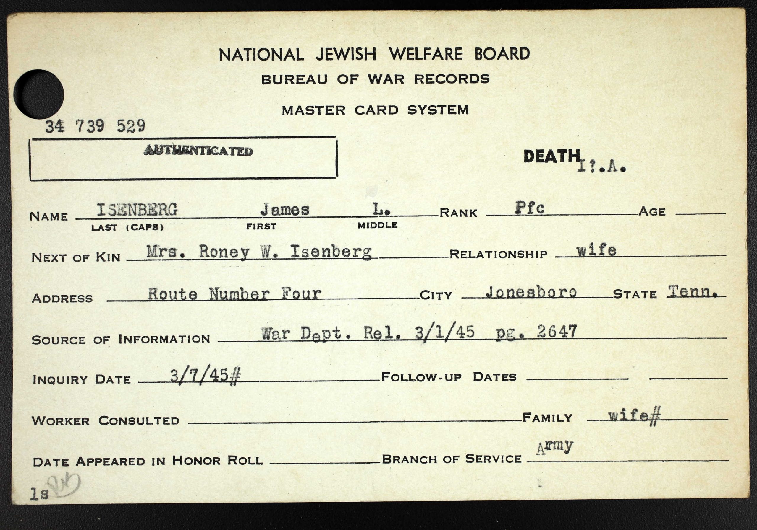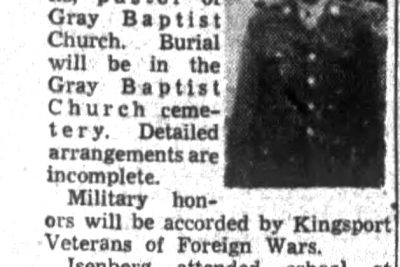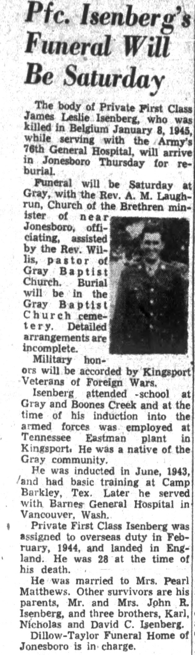 Isenberg attended school at Gray and Boones Creek and at the time of his induction into the armed forces was employed at Tennessee Eastman plant in Kingsport. He was a native of the Gray community. He was inducted in June, 1943, and had basic training at Camp Barkley, Tex. Later he served with Barnes General Hospital in Vancouver, Wash. Private First Class Isenberg was assigned to overseas duty in February, 1944, and landed in England. He was 28 at the time of his death. He was married to Mrs. Pearl Matthews. Other survivors are his parents, Mr. and Mrs. John R. Isenberg, and three brothers, Karl, Nicholas and David C. Isenberg.