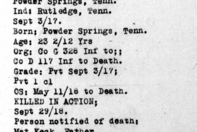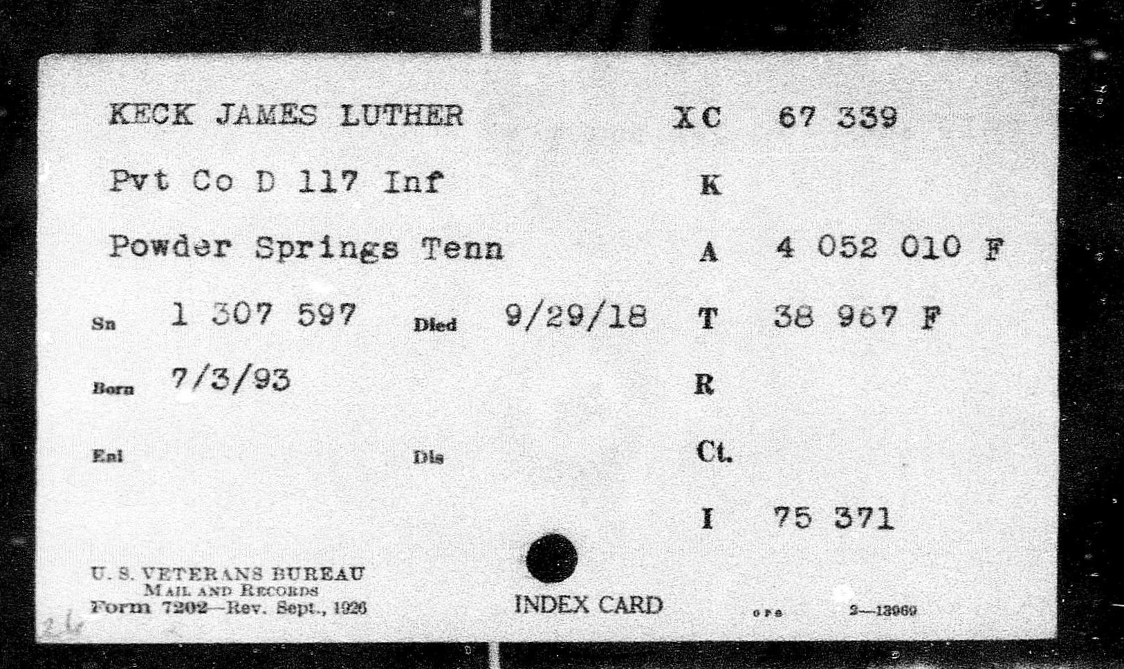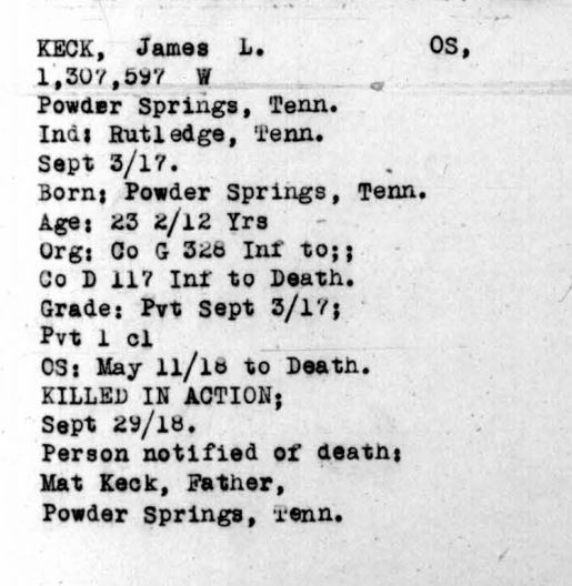 James Luther Keck was born in Powder Springs, Tennessee, son of Reuben Mathew Keck and Rebecca Jane Haynes. He was the husband of Jessie Starnes and father of Lester Lee Keck. He was killed in action on 29 September 1918 at the age of 23 and is listed on The Tablets of the Missing at Somme American Cemetery, Bony, France.