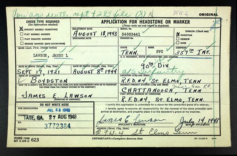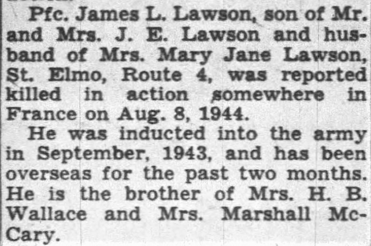 Pfc. James L. Lawson, son of Mr. and Mrs. J.E. Lawson and husband of Mrs. Mary Jane Lawson, St. Elmo, Route 4, was reported killed in action somewhere in France on Aug. 8, 1944. He was inducted into the army in September, 1943, and has been overseas for the past two months. He is the brother of Mrs. H.B. Wallace and Mrs. Marchall McCary.
