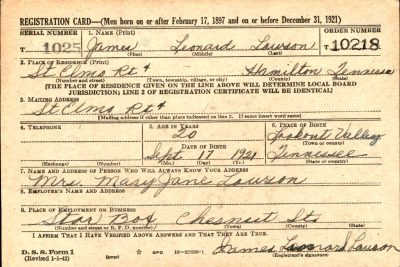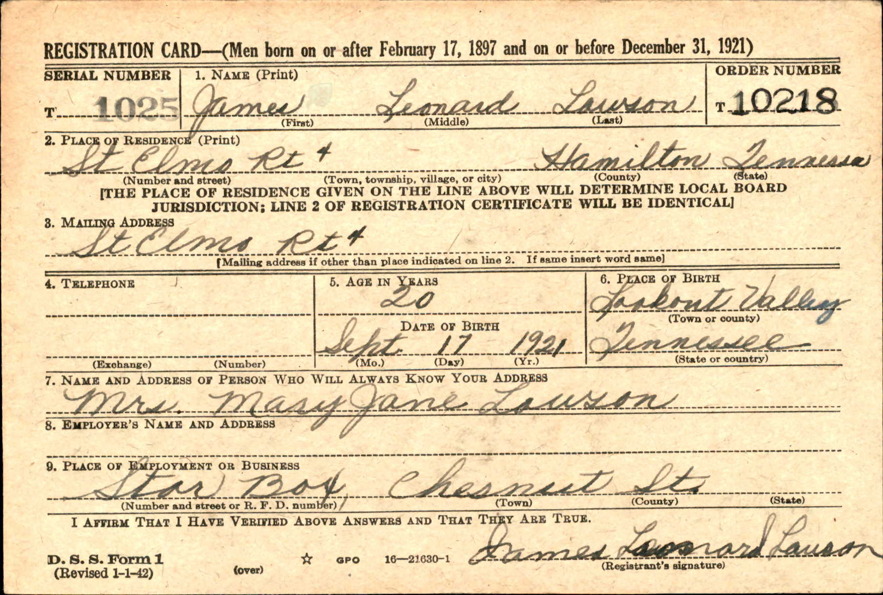 James Leonard Lawson was born at Lookout Valley, Tenn., on 17 September 1921 to James Emmitt Lawson and Elizabeth Caledonia Owens. Husband of Mary Jane Thompson.