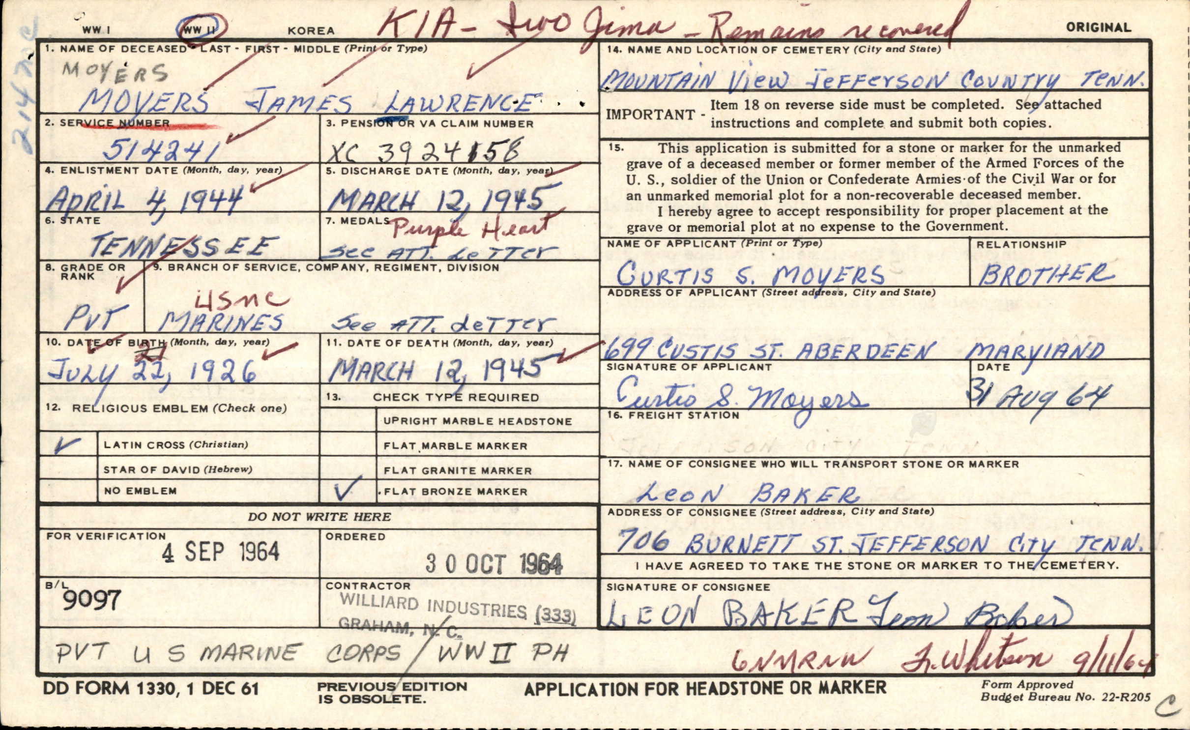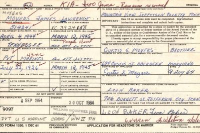 Pvt. James L Moyers, USMC – Wanda M. Moyers, Spring Hill Road,;