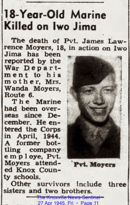 Private James Lawrence Moyers was the son of James C. Moyers and Verna Viola Lunce. Stepson of Mrs. Wanda Moyers.