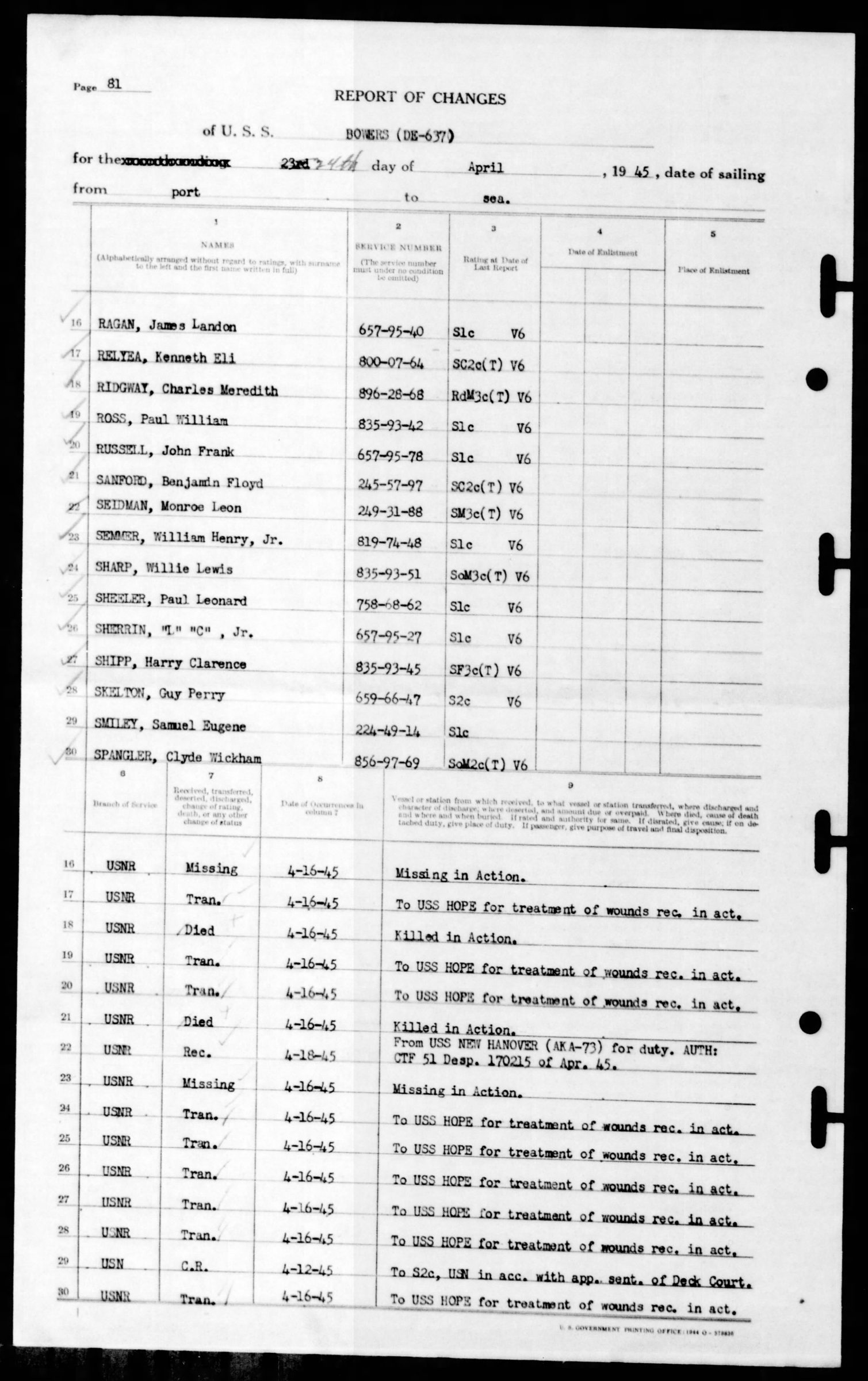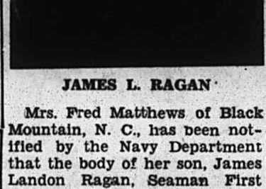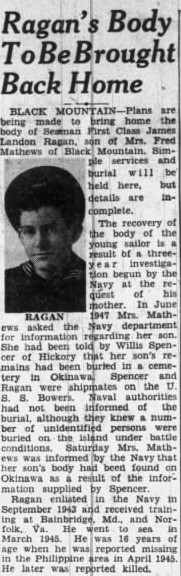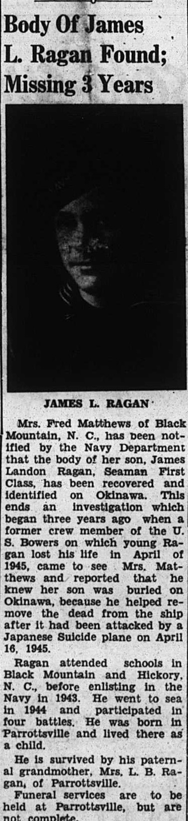 Mrs. Fred Matthews of Black Mountain, N.C. has been notified by the Navy Department that the body of her son, James Landon Ragan, Seaman First Class, has been recovered and identified on Okinawa. This ends an investigation which began three years ago when a former crew member of the U.S. Bowers of which young Ragan lost his life in April of 1945, came to see Mrs. Matthews and reported that he knew her son was buried on Okinawa, because he helped remove the dead from the ship after it had been attacked by a Japanese Suicide plane on April 16, 1945.