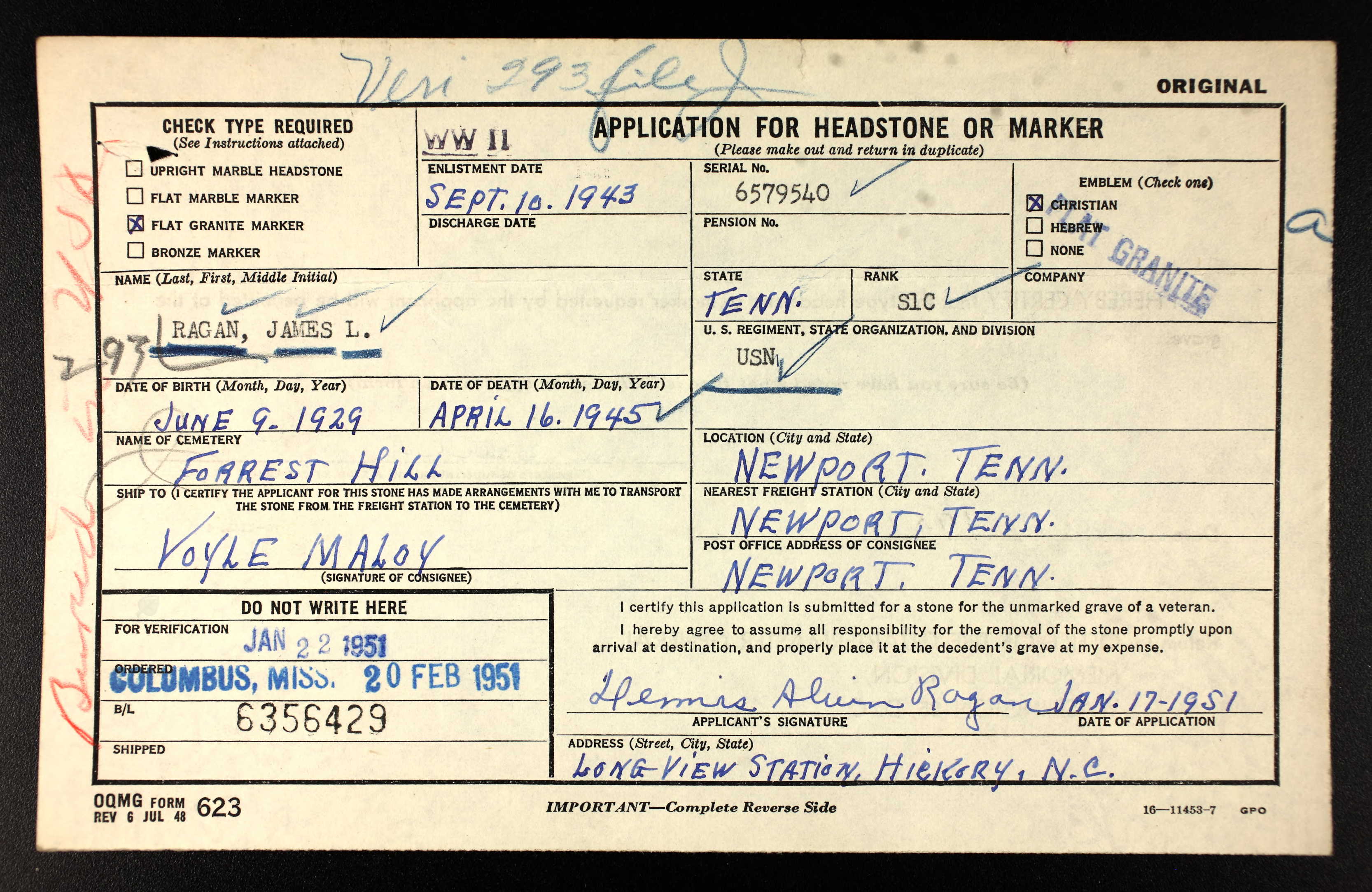 Ragan attended schools in Black Mountain and Hickory, N.C., before enlisting in the Navy in 1943. He went to sea in 1944 and participated in four battles. He was born in parrottsville and lived there as a child. He is survived by his paternal grandmother, Mrs. L.B. Ragan of Parrottsville.