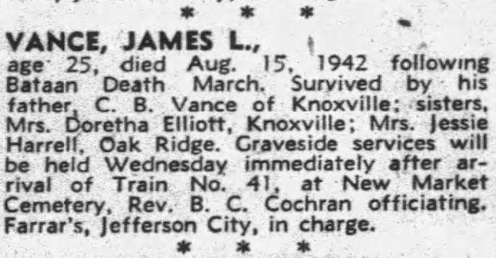 S/Sgt Vance was captured on 7 May 1942 in the Southwest Pacific Theatre, Philippine Islands. He died as prisoner of war at PW Camp #3, Old Bilibid Prison Rizal Manila Philippines 14-121.