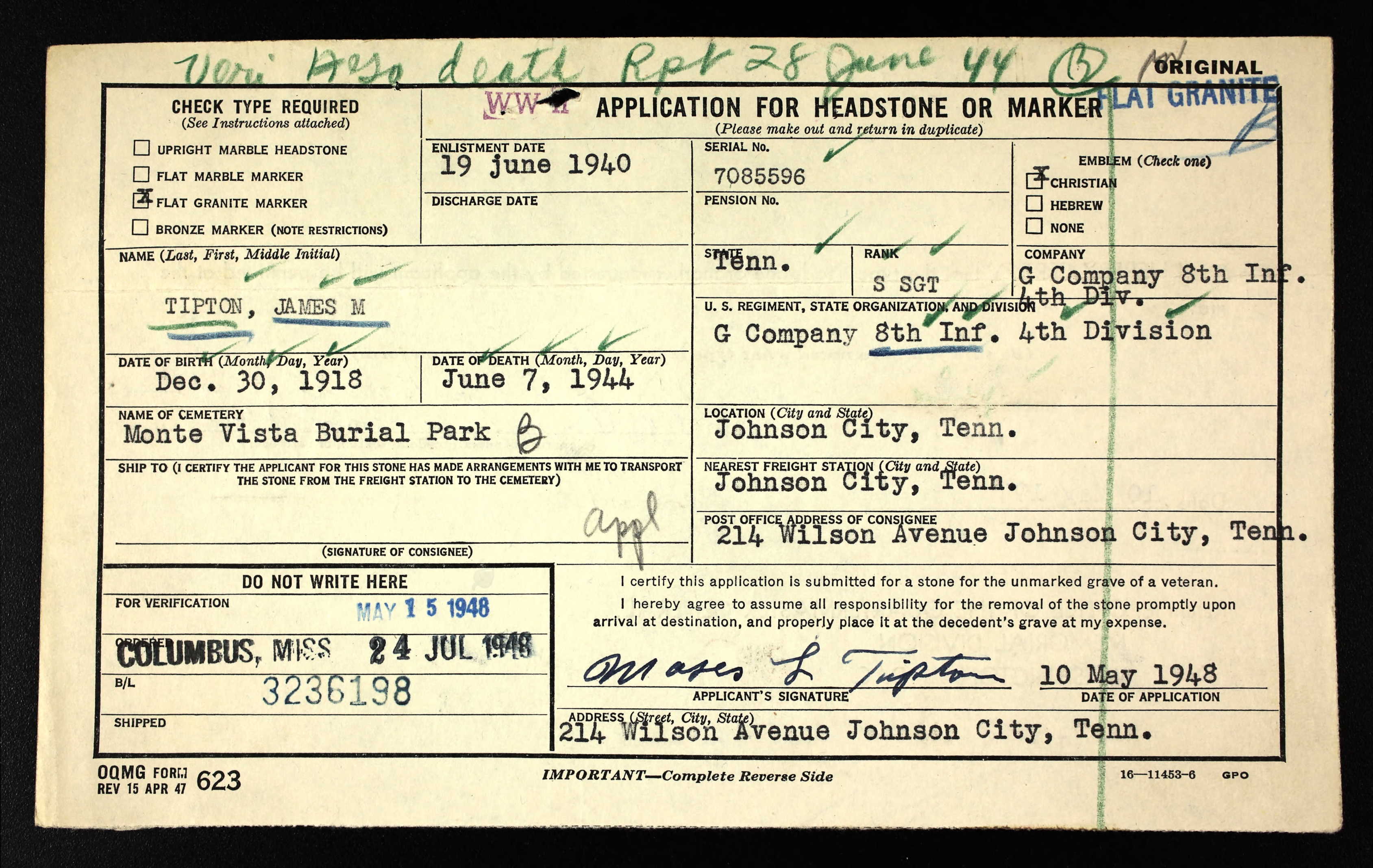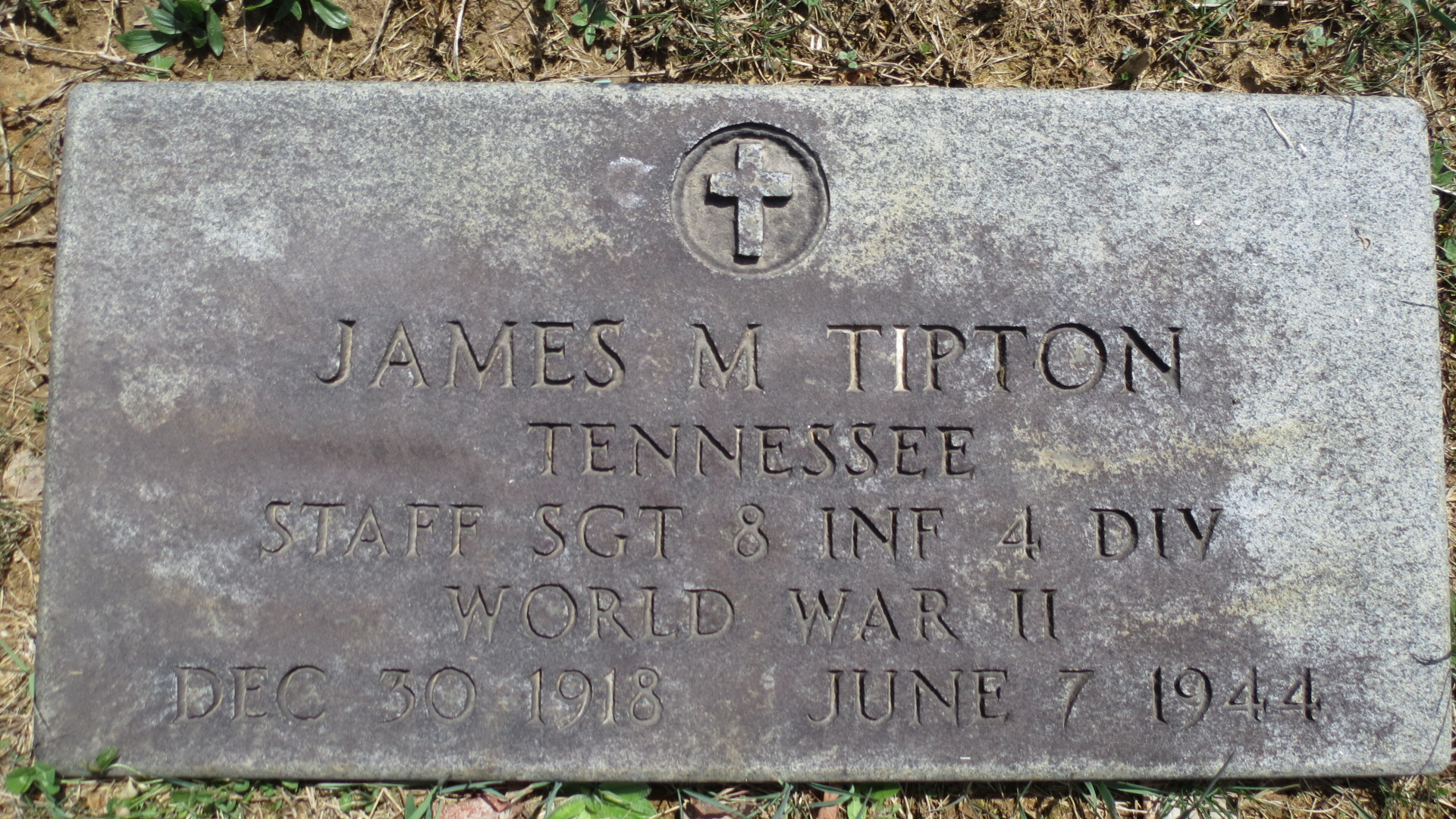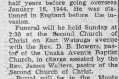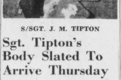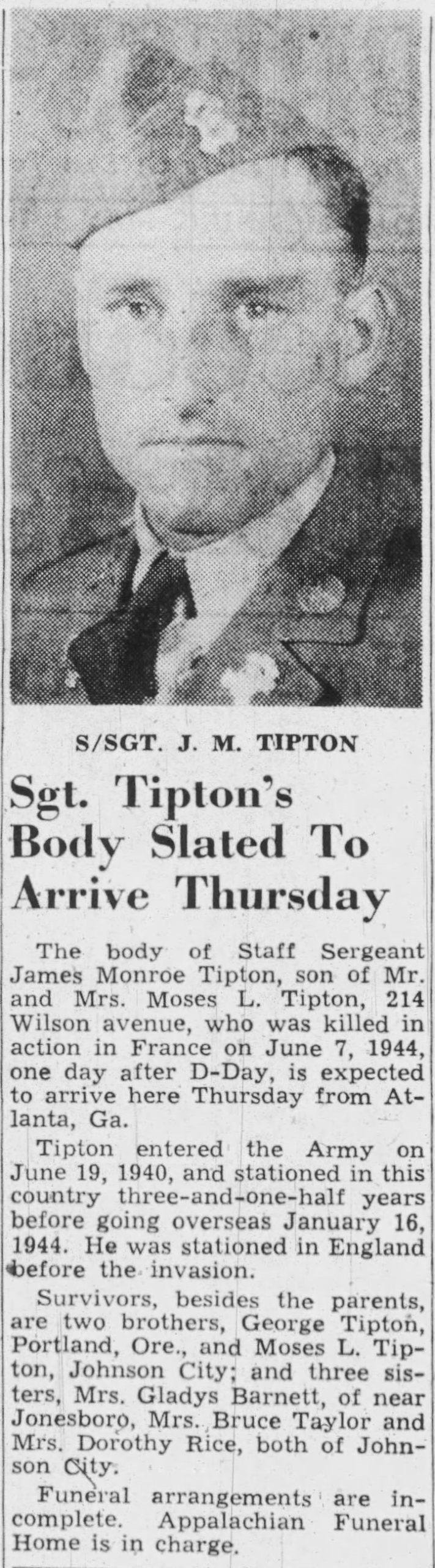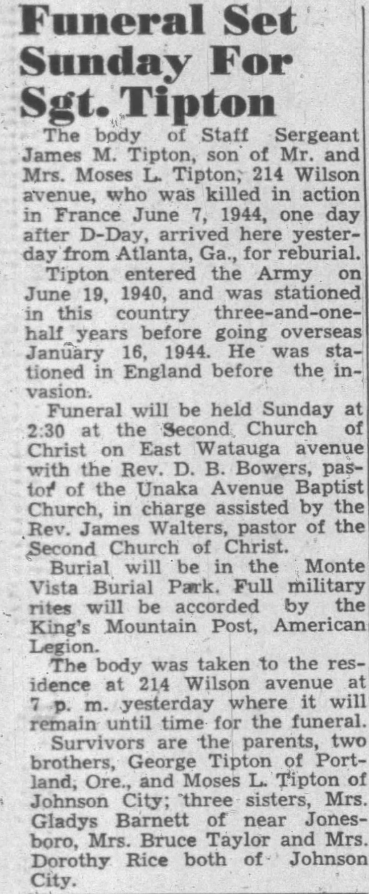 The body of Staff Sergeant James M. Tipton, son of Mr. and Mrs. Moses L. Tipton, 214 Wilson Avenue, who was killed in action in France June 7, 1944, one day after Day, arrived here yesterday from Atlanta, Ga., for reburial. Tipton entered the Army on June 19, 1940 and was stationed in this country three-and-one-half years before going overseas January 16, 1944. He was stationed in England before the invasion. Survivors are the parents, two brothers, George Tipton of Portland, Ore., and Moses L. Tipton of Johnson City; three sisters, Mrs. Gladys Barnett of near Jonesboro, Mrs. Bruce Taylor and Mrs. Dorothy Rice both of Johnson City.