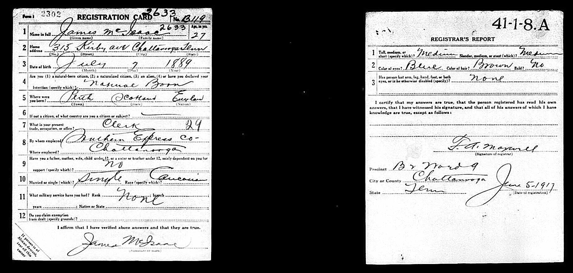 James McIsaac was born on July 7, 1889, in Perth, Scotland, the son of Peter and Margaret McIsaac. He had several brothers, including Peter, William, David, Alfred, and George. The family moved to the United States when James was a young boy, and settled in Hamilton County, Tennessee. McIsaac was employed as a clerk in Chattanooga before he enlisted in the United States Navy as a Fireman, 2nd Class, in the USNRF in New Orleans, Louisiana, on December 11, 1917. He was later stationed in Pelham Bay Park, New York, where he became ill from pneumonia. He passed away from the disease on October 5, 1918. Fireman 2nd Class McIsaac is buried at Chattanooga National Cemetery.