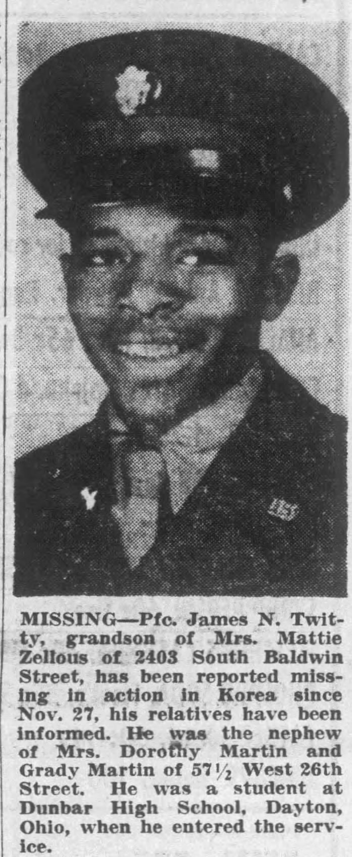 Pfc. James N. Twitty, grandson of Mrs. Mattie Bellows of 2403 South Baldwin Street, has been reported missing in action in Korea since Nov. 27, his relatives have been informed. He was the nephew of Mrs. Dorothy Martin and Grady Martin of 57½ West 26th Street. He was a student at Dunbar High School, Dayton, Ohio, when he entered the service.