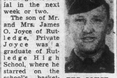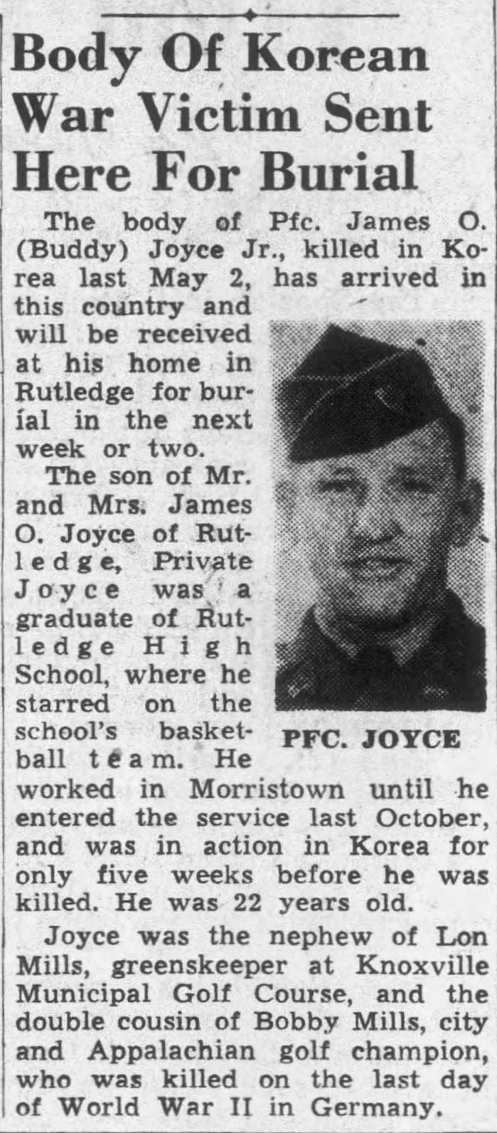 The body of Pfc. James O (Buddy) Joyce Jr., killed in Korea last May 2, has arrived in this country and will be received at his home in Rutledge for burial in the next week or two. The son of Mr. and Mrs. James O Royce of rutledge, Private Joyce was a graduate of Rutledge High School, where he starre don the school’s basketball team. He worked in Morristown until he entered the service last October, and was in action in Korea for only five weeks before he was killed. He was 22 years old. Joyce was the nephew of Lon Mills, greenskeeper at Knoxville Munical Golf Course, and the double cousin of Bobby Mills, city and Appalachian golf champion, who was killed on the last day of World war II in Germany,