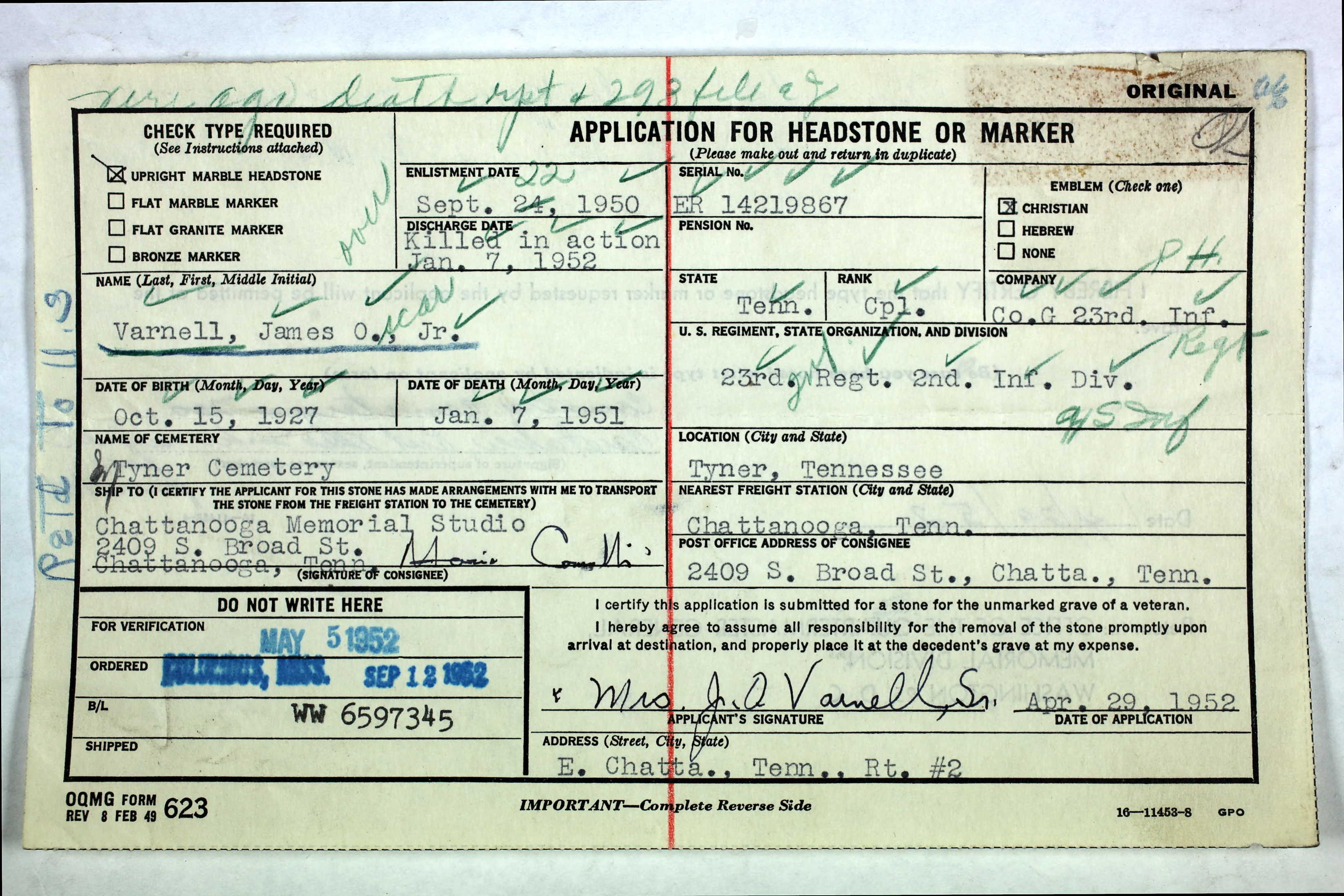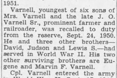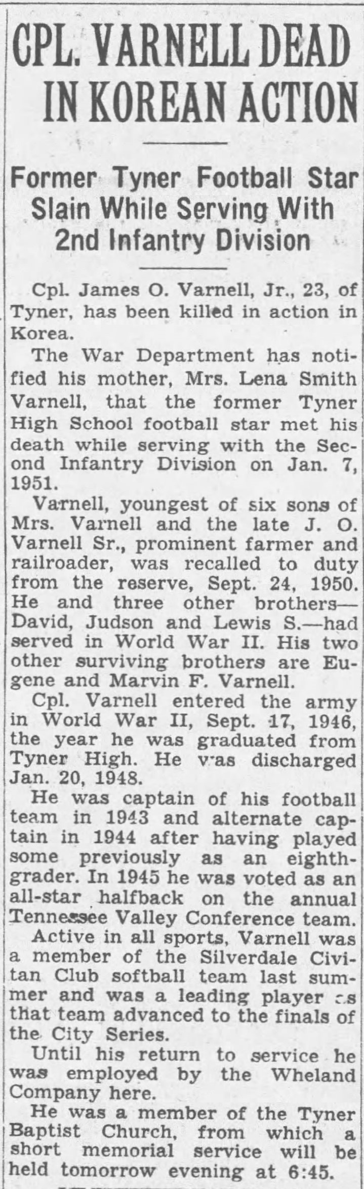 Cpl. James O. Varnell, Jr., 23, of Tyner, has been killed in action in Korea. The War Department has notified his mother, Mrs. Lena Smith Varnell, that the former Tyner High School football star met his death while serving with the Second Infantry Division on Jan. 7, 1951. Varnell, youngest of six sons of Mrs. Varnell and the late J.O. Varnell Sr., prominent farmer and railroader, was recalled to duty from the reserve, Sept. 24, 1950. He and three brothers – David, Judson and Lewis S. – had served in World War II. His two other surviving brothers are Eugene and Marvin F. Varnell. Cpl. Varnell entered the army in World War II, Sept. 17, 1946, the year he was graduated from Tyner High. He was discharged Jan. 20, 1948. He was captain of his football team in 1943 and alternate captain in 1944 after having played some previously as an eight-grader. In 1945 he was voted as an all-star halfback on the annual Tennessee Valley Conference team. Active in all sports, Varnell was a member of the Silverdale Civilian Club softball team last summer and was a leading player as that team advanced to the finals of the City Series. Until his return to service he was employed by the Wheland Company here. He was a member of the Tyner Baptist Church from which a short memorial service will be held tomorrow.