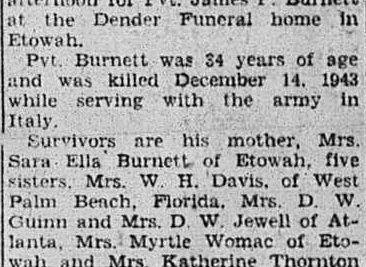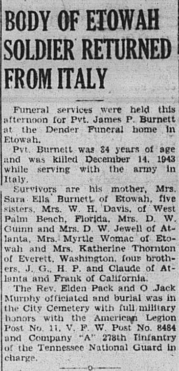 Funeral services were held this afternoon for Pvt. James P. Burnett at the Dender Funeral home in Etowah. Pvt. Burnett was 34 years of age and was killed December 14, 1943 while serving in the army in Italy. Survivors are his mother, Mrs. Sara Ella Burnett of Etowah, five sisters, Mrs. W.H. Davis of West Palm Beach, Florida, Mrs. D.W. Guinn and Mrs. D.W. Jewell of Atlanta, Mrs. Myrtle Womac of Etowah and Mrs. Katherine Thornton of Everett, Washington, four brothers, J.G., H.P. and Claude of Atlanta, and Frank of California.