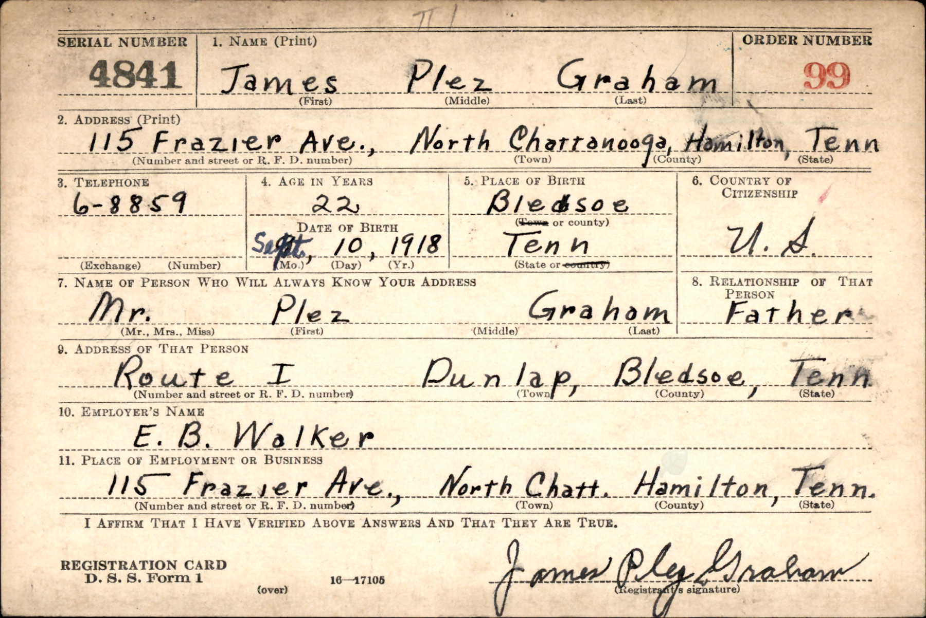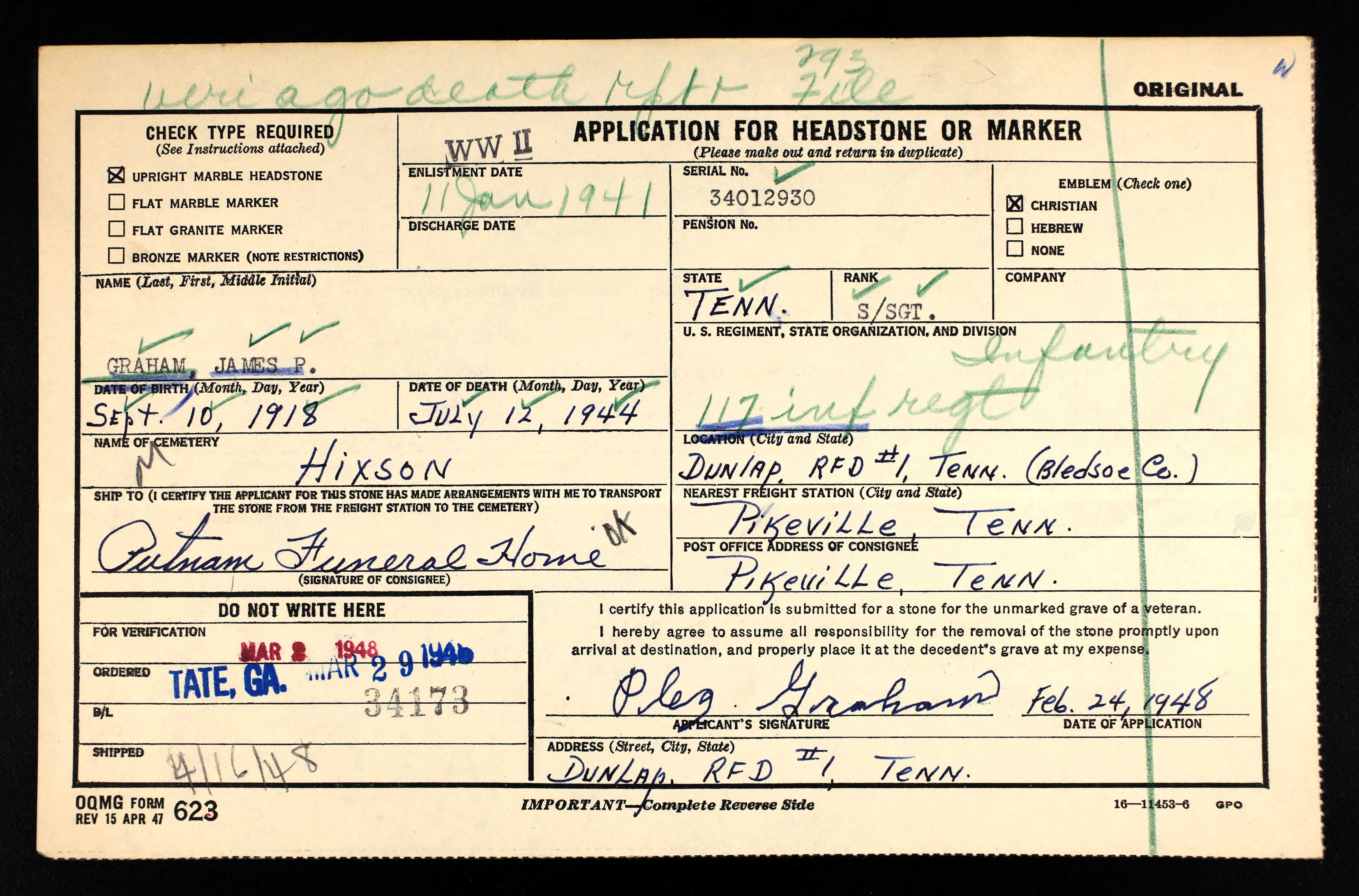 James Plez Graham was born September 10, 1918. He was the son of Plez and Ruth A. Graham of Bledsoe County, Tennessee. He attended grammar school and was never married. James enlisted in the United States Army on January 11, 1941 at Fort Oglethorpe, Georgia. He was promoted to Staff Sergeant and served with Company C, First Battalion, 117th Infantry, 30th Division in the European Theater in Normandy. He was killed in action on July 12, 1944. Staff Sergeant Graham was repatriated and buried at the John M. Hixon Cemetery in Bledsoe County, Tennessee. He was awarded the Combat Infantryman Badge and a Purple Heart.