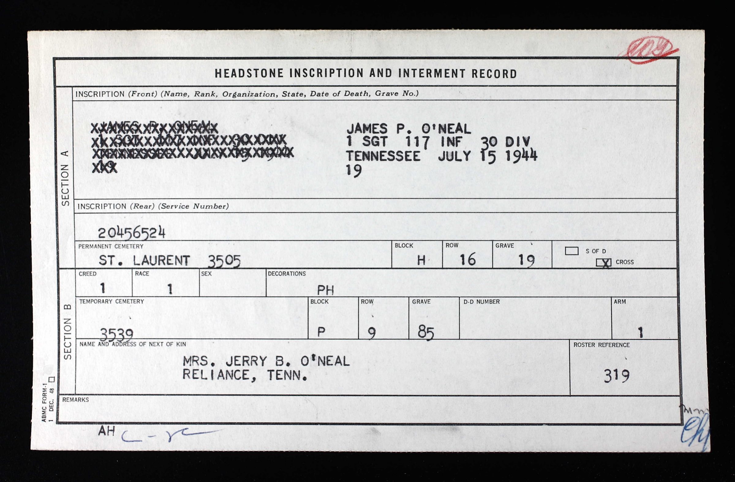 James P. O’Neal served with Company D, First Battalion, 117th Infantry Regiment, 30th Infantry Division in the European Theater. He was killed in action in Normandy. He was initially buried at La Cambe Cemetery at Isigny, France and reburied at Normandy American Cemetery, Colleville-sur-Mer, France, Plot H, Row 16, Grave 19.