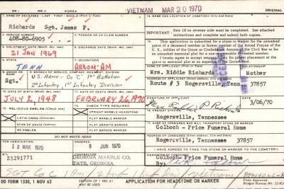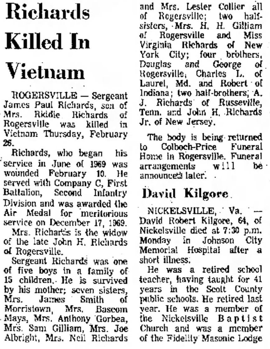 Rogersville – Sergeant James Paul Richards, son of Mrs. Riddie Richards of Rogersville was killed in Vietnam Thursday, February 26.