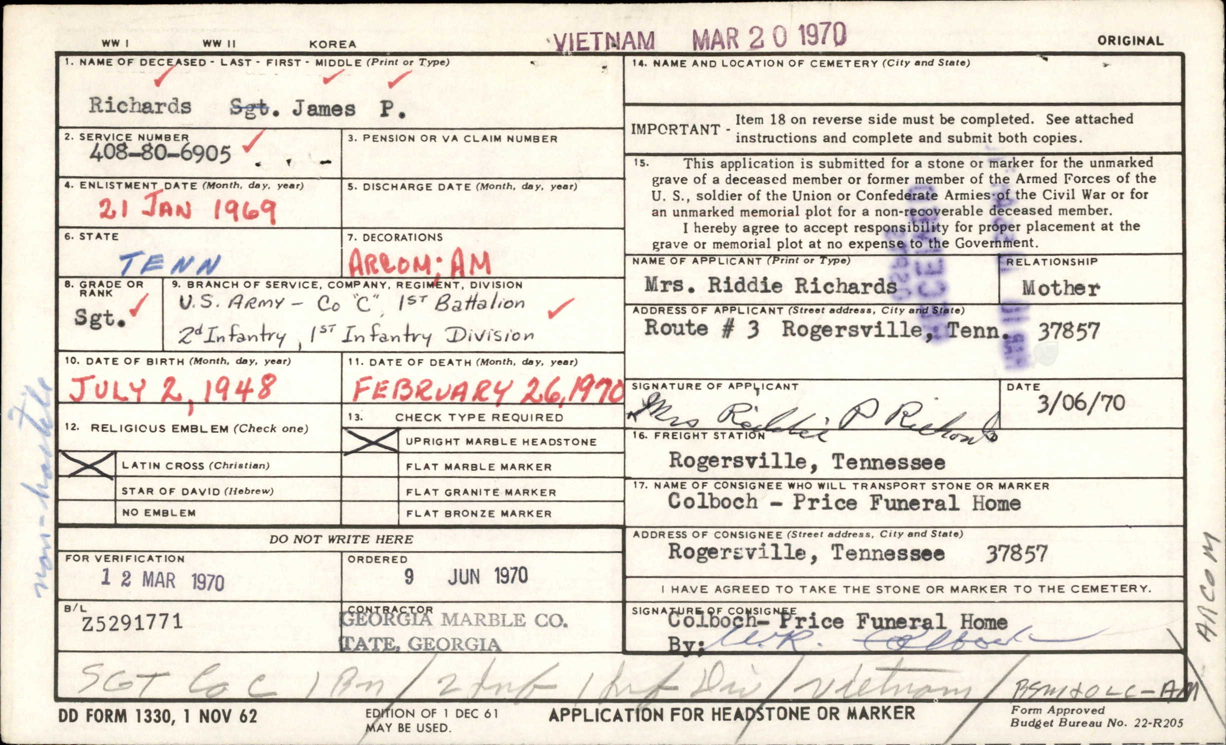 Richards, who began his service in June of 1969 was wounded February 10, He served with Company C, First Battalion, Second Infantry Division and was awarded the Air Medal for meritorious service on December 17, 1969.