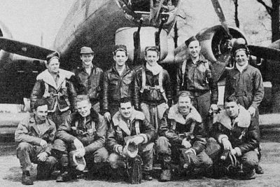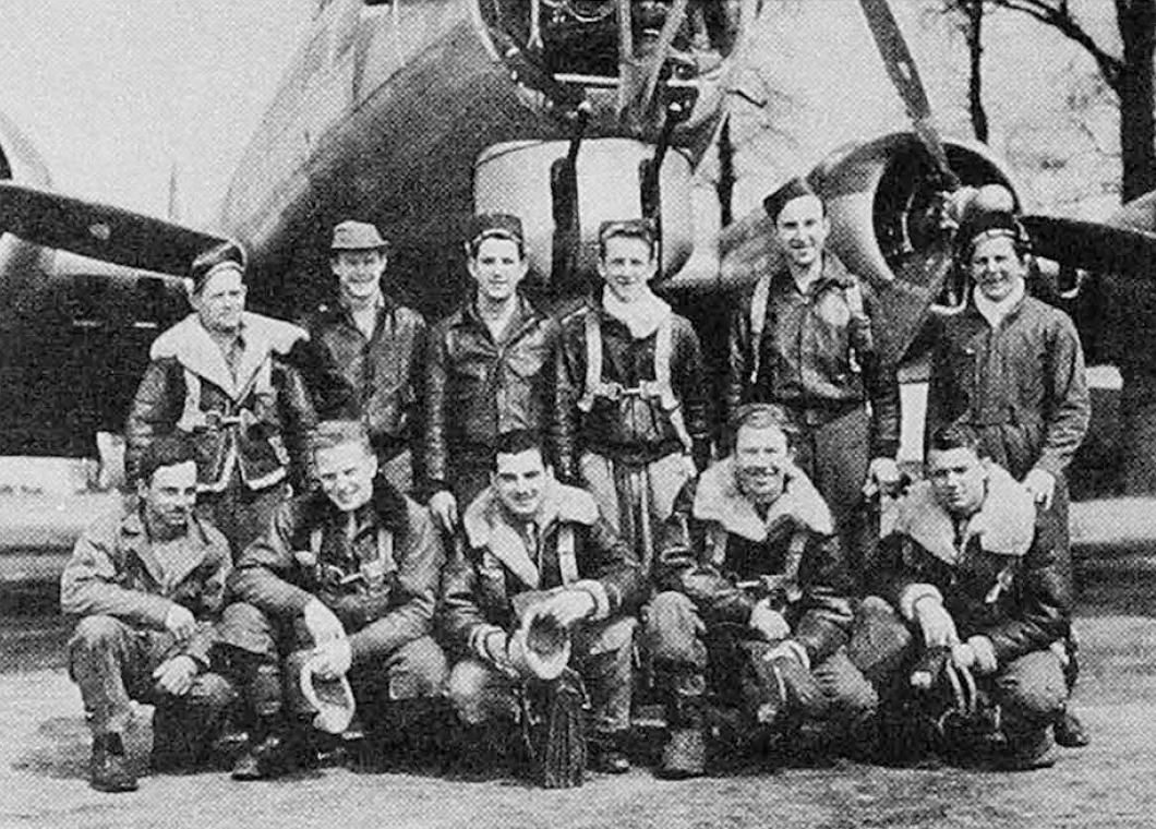 Hayden Hughes crew, 447th Bomb Group, 708th Squadron. Photo taken at Rattlesden, England, March, 1944. Order unknown: Lt. Hayden T. Hughes, Lt. Howard N. Barr, Lt. William H. Allen Jr., Lt. Richard H. Johnson, Sgt. Walter J. Zesut, Sgt. Raymond J. Small, Sgt. James R. Boyd, Sgt. Roger Hess, Sgt. Barley E. Hill, Sgt. George R. Bentley.
