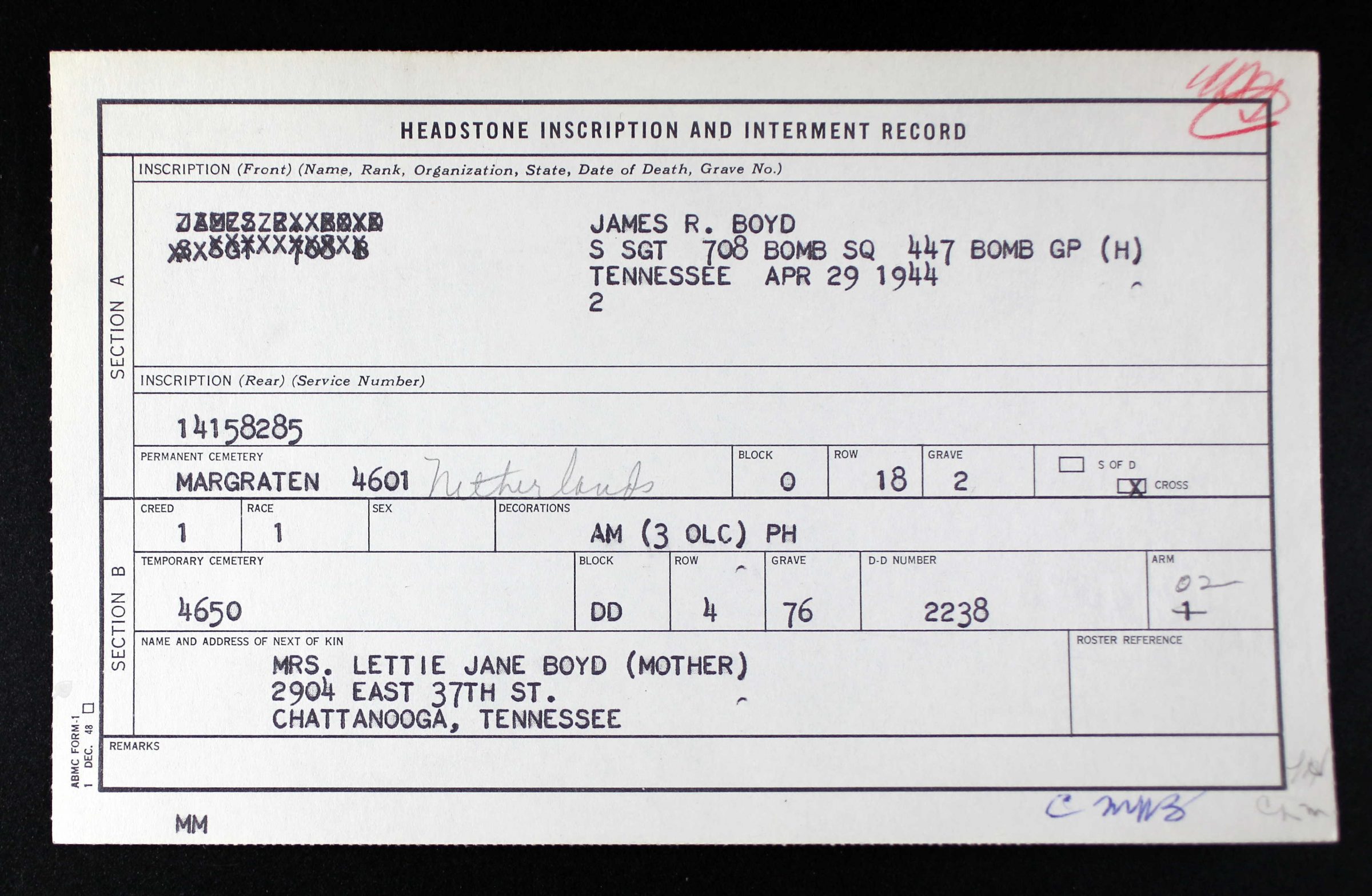 Staff Sergeant James R. Boyd was assigned to the 708th Bomber Squadron, 447th Bomber Group flying a B-17 out of Rattlesdale, England. He was Killed in Action 29 April 1944 and is interred at O,18,2, Netherlands American Cemetery, Margraten, Netherlands.