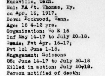 He enlisted April 12, 1917. As a member of Company E, 16th Infantry, 1st Division, he received his military training in Texas. Sailed for overseas duty on June 10, 1917. As a member of his command was active until April 1918 and since that date was never heard from again. He was killed in action near Soissons, France.