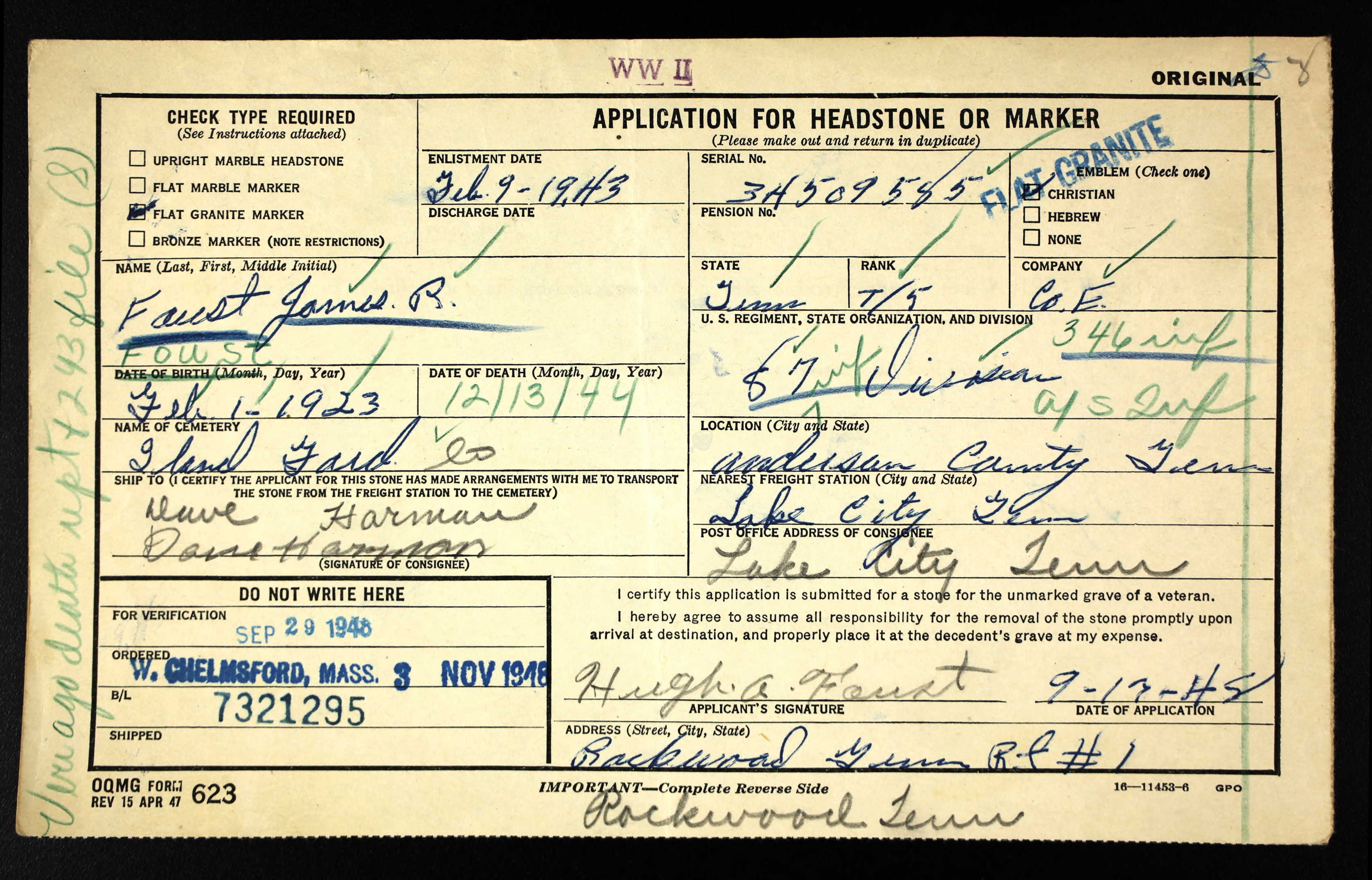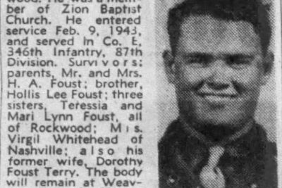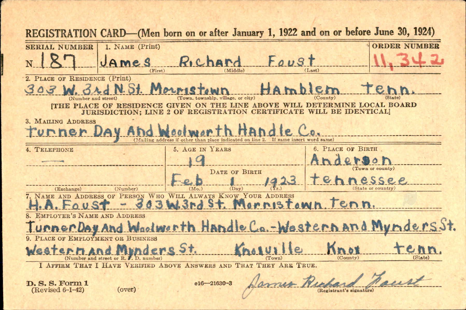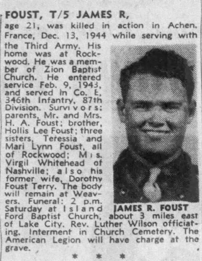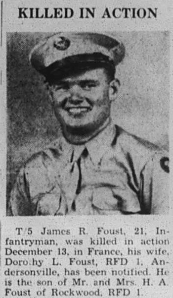 James Richard Foust was born near Island Ford, Anderson County, TN, the son of Hugh Alfred Foust adn Lillie May Cole. His sisters were Maxie Irene Foust, Vesta Verlena Foust, Teressia A. Foust and Mari Lynn Foust. He had one brother, Hollis Lee Foust. He married Dorothy Ridenour on 10 July 1944. James Foust served with the Civilian Conservation Corps prior to his World War II service.