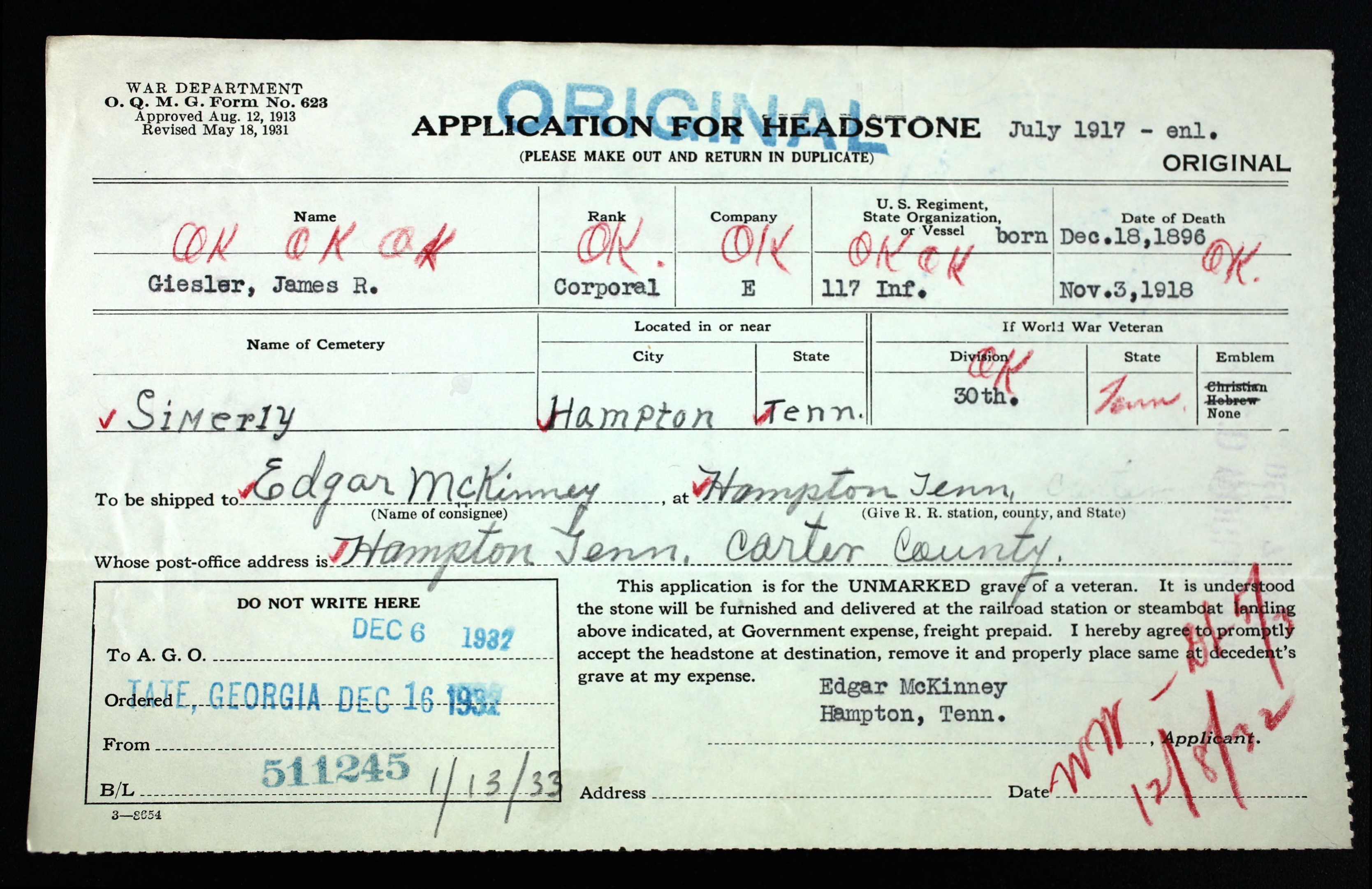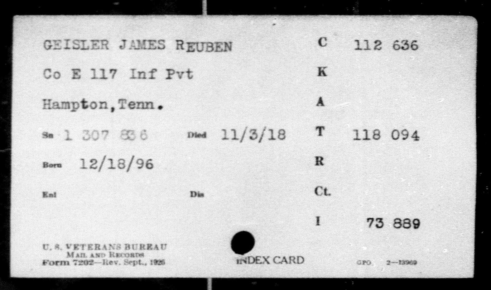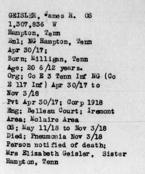 James Reuben Geisler was born in Milligan, Tennessee. He died at the age of 20 from non-battle wounds (pneumonia) and is buried in Happy Valley Memorial Park, Elizabethton, TN.